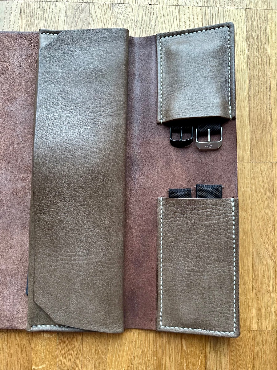 ich musste Feststellen das mein erstes Etui suboptimal war. Ich bin ja ein Fan von Nassgeformten Leder, das ist für EDC wie Messer, Taschenlampen und Karten + Geldetuis supergeil. Aber für Uhren nicht so gut. Es war einfach Zuviel Druck auf dem unteren Band und Federsteg!