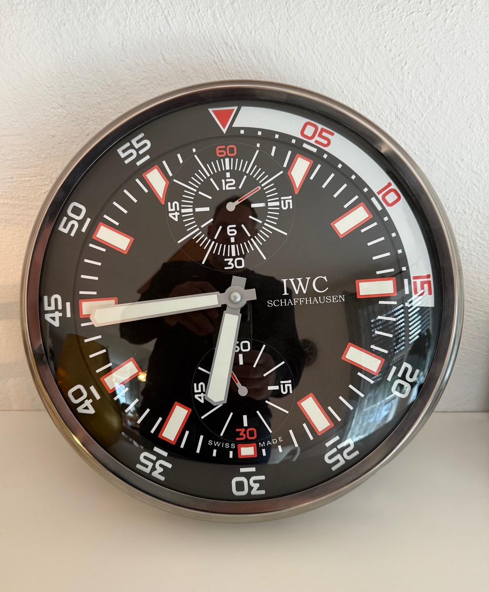 Einige Jahre hing sie im Büro und funktionierte einwandfrei. Eines Montag morgens lag die Uhr am Boden, eine ordentliche Macke am Gehäuse und ein frei durchschwingender Zeiger