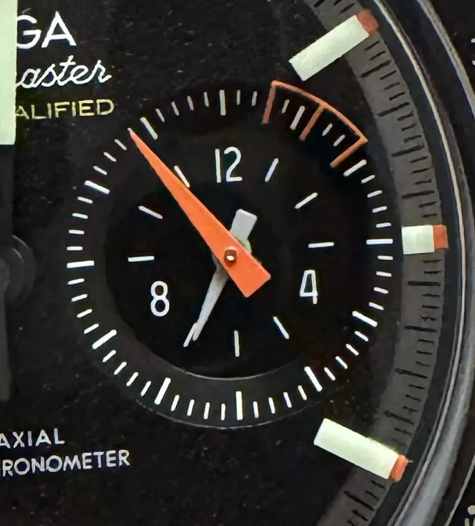 Ob das gekörnte Zifferblatt zweiteilig ist (wie bei der neuen Speedy Professional Reverse-Panda) und die beiden Totalisatoren eine Etage darunter liegen, oder ob es sich um ein zusammenhängendes Zifferblatt handelt, konnte ich noch nicht in Erfahrung bringen.