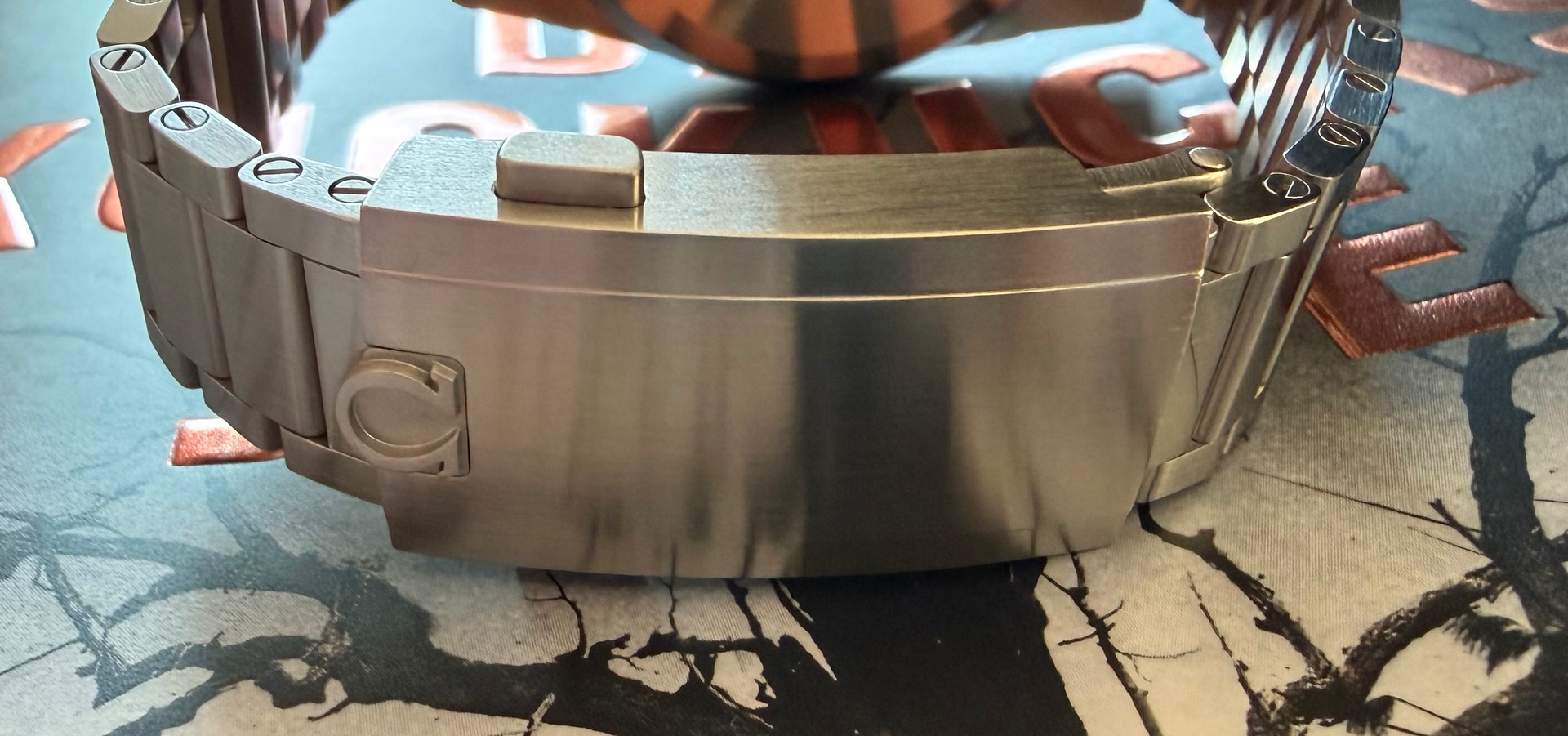 Armband und Schließe sind dagegen eindeutig von der Speedmaster 57 ausgeliehen und dann komplett auf der Oberfläche gebürstet.
