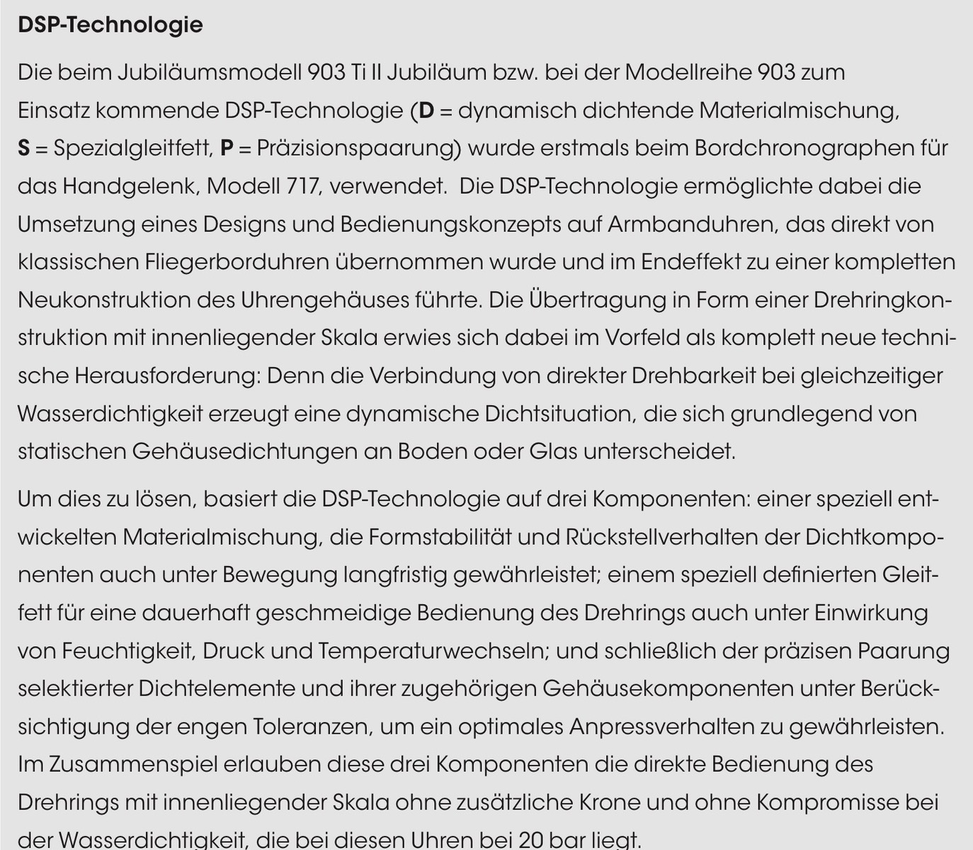 Mit dem Modell 717 adaptierten wir das Erbe der traditionellen Borduhr erstmals auf eine Armbanduhr: Gleiche Grundfunktionen kombiniert mit moderner Uhrentechnik – zentrale Stoppsekunde und -minute, Fliegerdrehring mit innenliegender Skala, hohe Ablesbarkeit, aber alles in Kombination mit einer Wasserdichtheit bis 20 bar. Später folgte eine Übertragung der DSP-Technologie auf die Modellreihe 903. Dieses Modell profitiert wegen der daraus folgenden, stark vereinfachten Bedienung der Rechenschieberfunktion im besonderen Maße von der Technologie.
