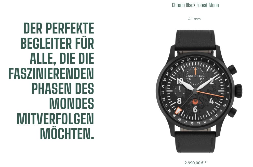 Angetrieben wird der Zeitmesser vom bewährten Automatikwerk ETA 7751 in Top-Finish-Qualität. Eine Druckfestigkeit von 5 ATM rundet das technische Gesamtpaket ab und macht den Chrono Black Forest Moon zu einem verlässlichen Begleiter – bei Tag und Nacht