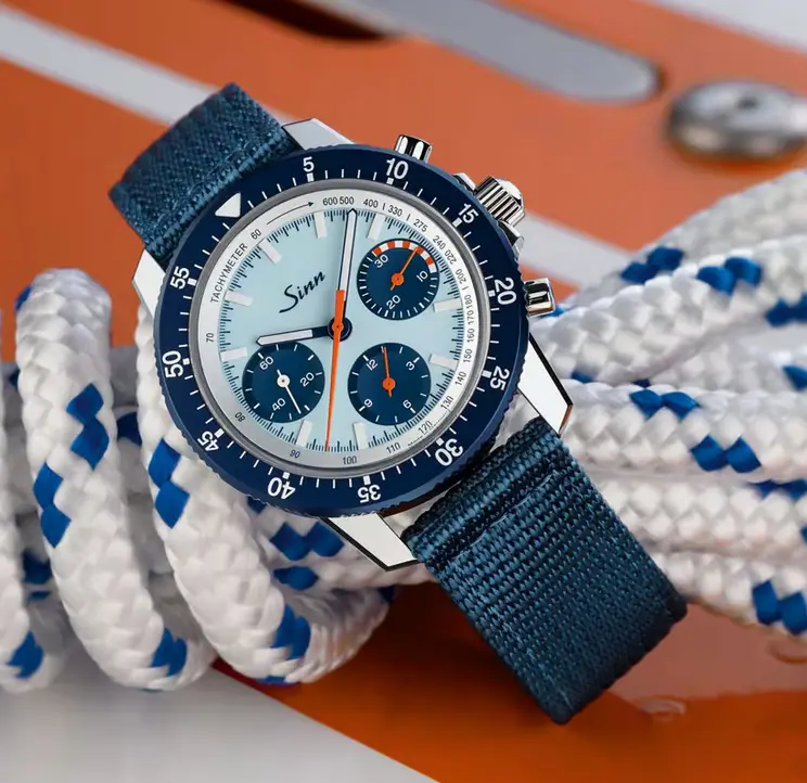 Details: hellblau glänzendes Zifferblatt mit dunkelblau seidenmatten Zählerkreisen, Tricompax, orangefarbene Stoppsekunden- und Stoppminutenzeiger mit weiß-orange alternierend markierten Stoppminutenskala für die ersten 10 Minuten. Hybridkeramischen Nachleuchtelementen.