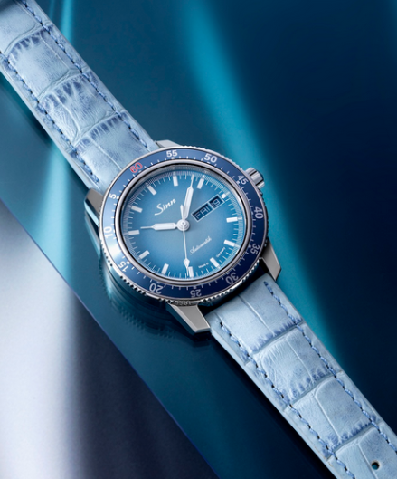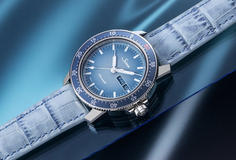 Details: matt gestrahltes Gehäuse, rote 60 auf der Lünette anlässlich des Jubiläums, hellblaues Blatt mit Farbverlauf, Lederband hellblau