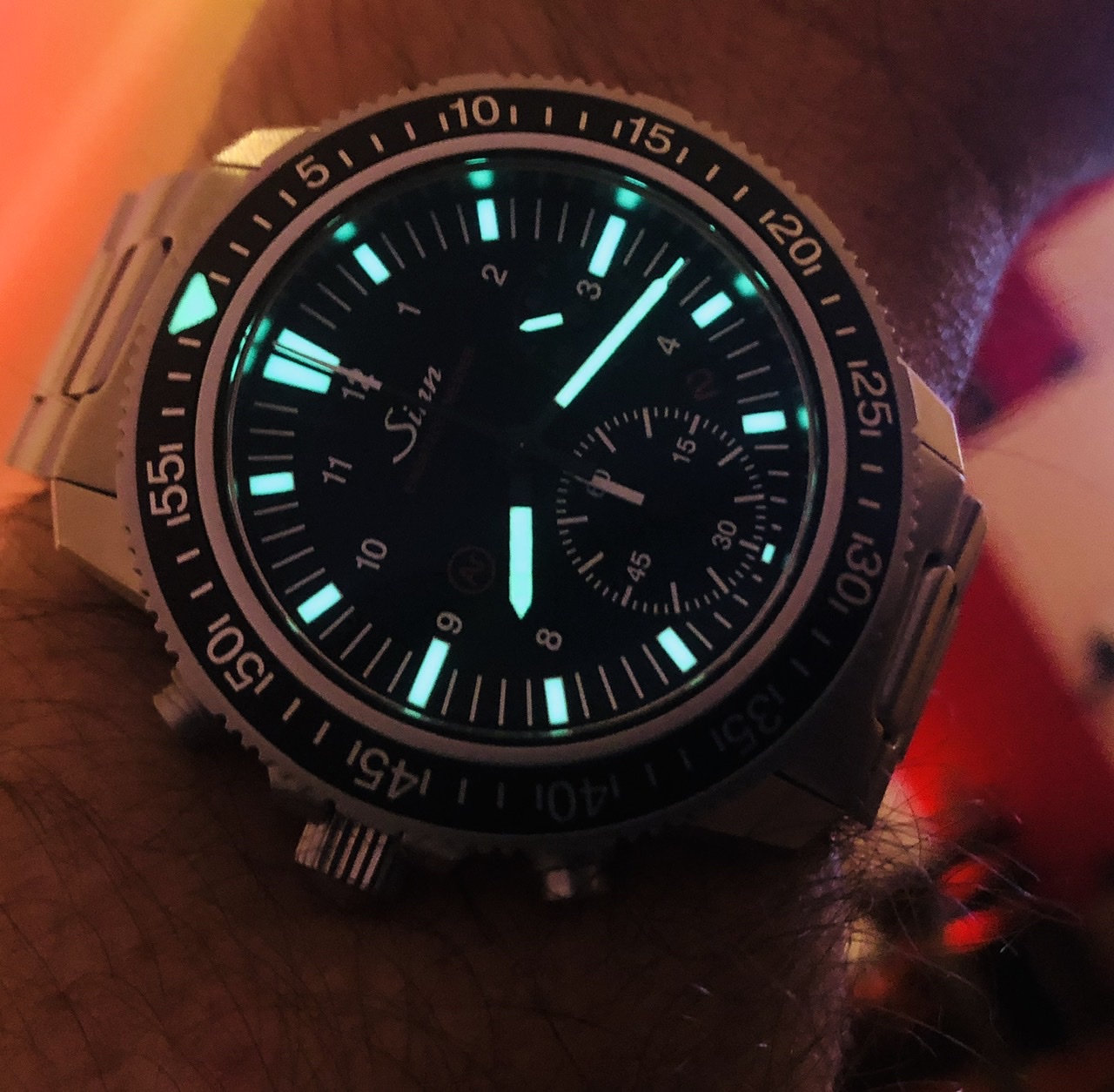 Die tolle Ablesbarkeit verschwindet im Laufe der Nacht, da die Zeiger von den Indizes kaum oder gar nicht unterscheidbar sind! Also dann, wenn die Lume noch gut leuchtet, die Zeiger nur noch Flecken neben den Indizes sind, die nicht mehr unterschieden werden können. Die Zeiger sind zudem nur in der oberen Hälfte mit Leuchtmasse belegt.