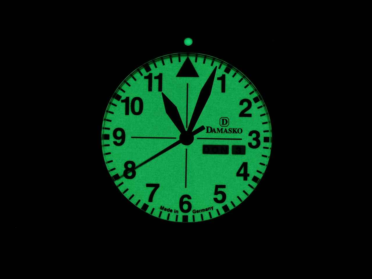 Die tolle Ablesbarkeit verschwindet im Laufe der Nacht, da die Zeiger von den Indizes kaum oder gar nicht unterscheidbar sind! Also dann, wenn die Lume noch gut leuchtet, die Zeiger nur noch Flecken neben den Indizes sind, die nicht mehr unterschieden werden können. Die Zeiger sind zudem nur in der oberen Hälfte mit Leuchtmasse belegt.