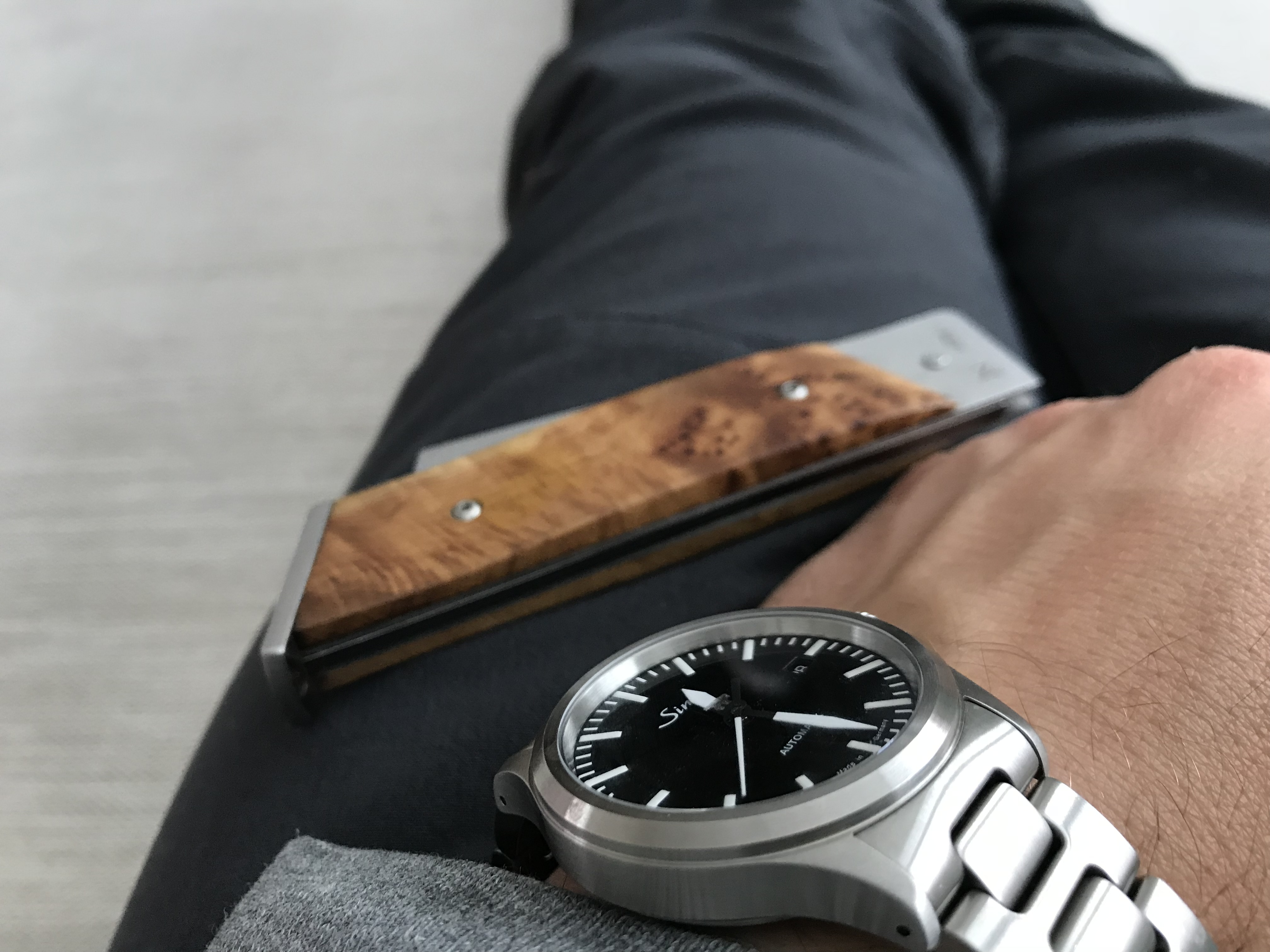 Mit Ihrer Größe von 38,5 im Durchmesser ist Sie für mein schmales Handgelenk maßgeschneidert. Das tiefschwarze Zifferblatt ist beeindruckend intensiv, die schneeweißen Zeiger sind als Kontrast perfekt, der Sekundenzeiger hat für mich schon fast eine magnetische Anziehungskraft(Traumhaftes Zeigerspiel). Ich liebe Ihren bescheidenen Charme, Sie kann auch alles, von sportlich bis zu Elegant, eine Uhr die eigentlich zu jedem und Anlass passt.