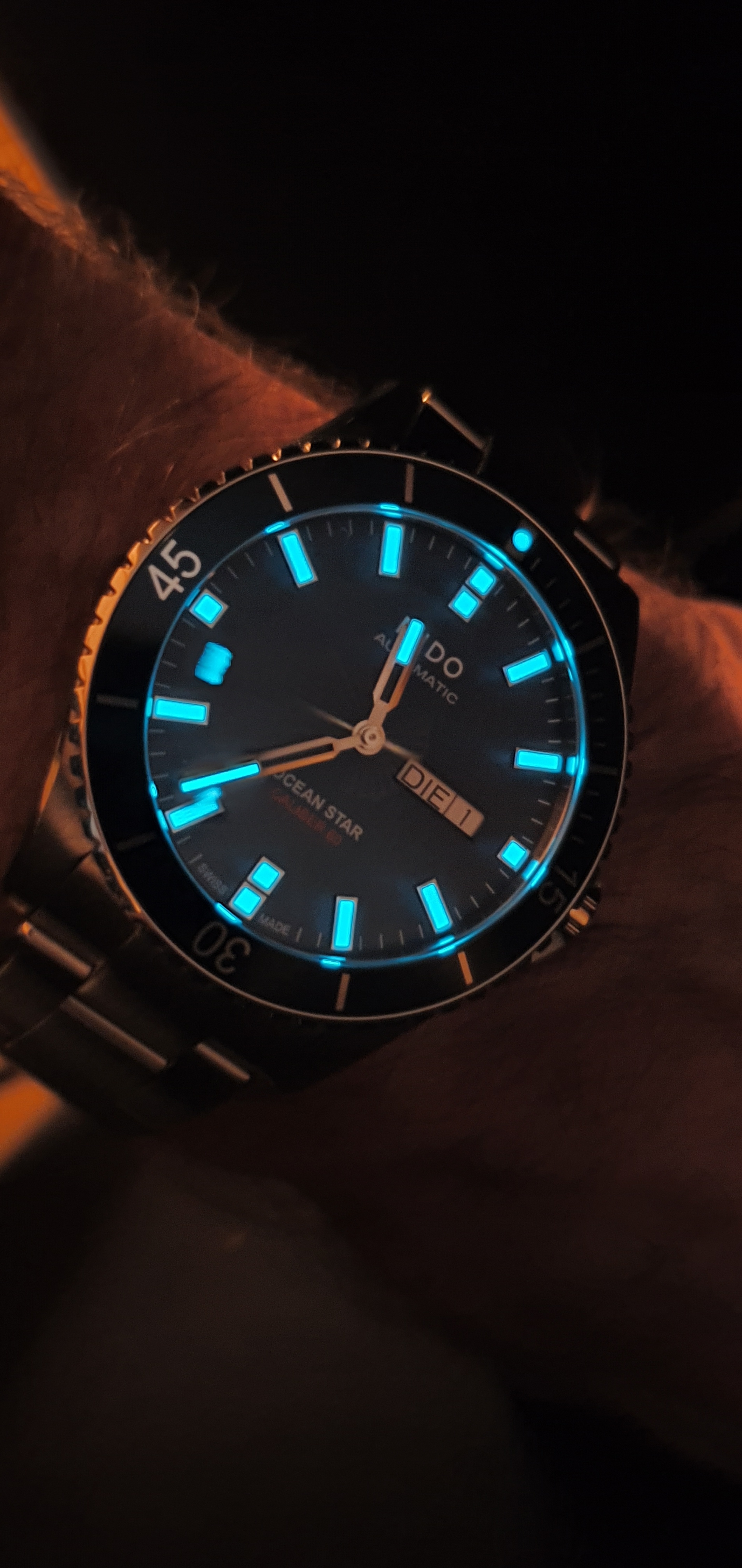Mido Ocean Star (20 atm / 42,5 mm durchmesser) ist bei meiner Arbeit praktisch: day date Funktion und gute Ablesbarkeit (AR beidseitig).