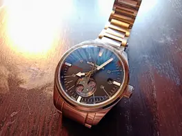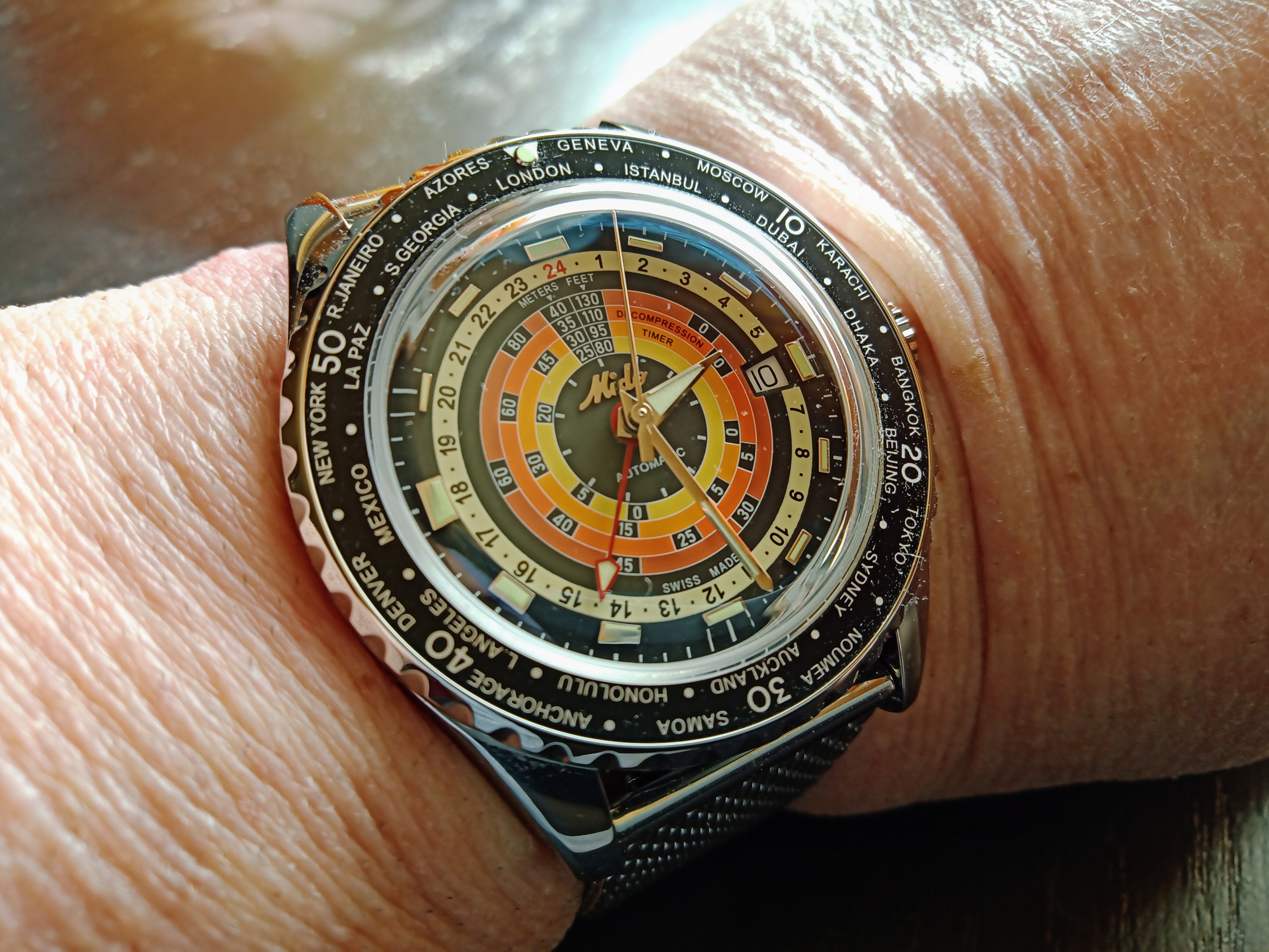 Die siebziger Jahre lassen grüßen. Phoibos. Uhrwerk Miyota 9015. Saphirglas. Lünette aus Keramik. Zifferblatt irgendwie " gebürstet" . Je nach Lichtwinkel von schwärzlich bis grün schimmernd. Zeiger und Indexe golden umrandet und mit elfenbeinfarbener Lume gefüllt. Hochleistungslume Original Schweiz, man merkt es, Zeiger und Indexe leuchten zuverlässig die ganze Nacht über. Laut Beschreibung 15 Mal beschichtet. 300 m wasserdicht. Sogenanntes Reiskornarmband, teilweise gebürstet und poliert, Glieder verschraubt. Verschraubte Krone. Die Uhr ist insgesamt so hochwertig verarbeitet, das man den Kaufpreis von unter 500 Euro kaum glauben mag.