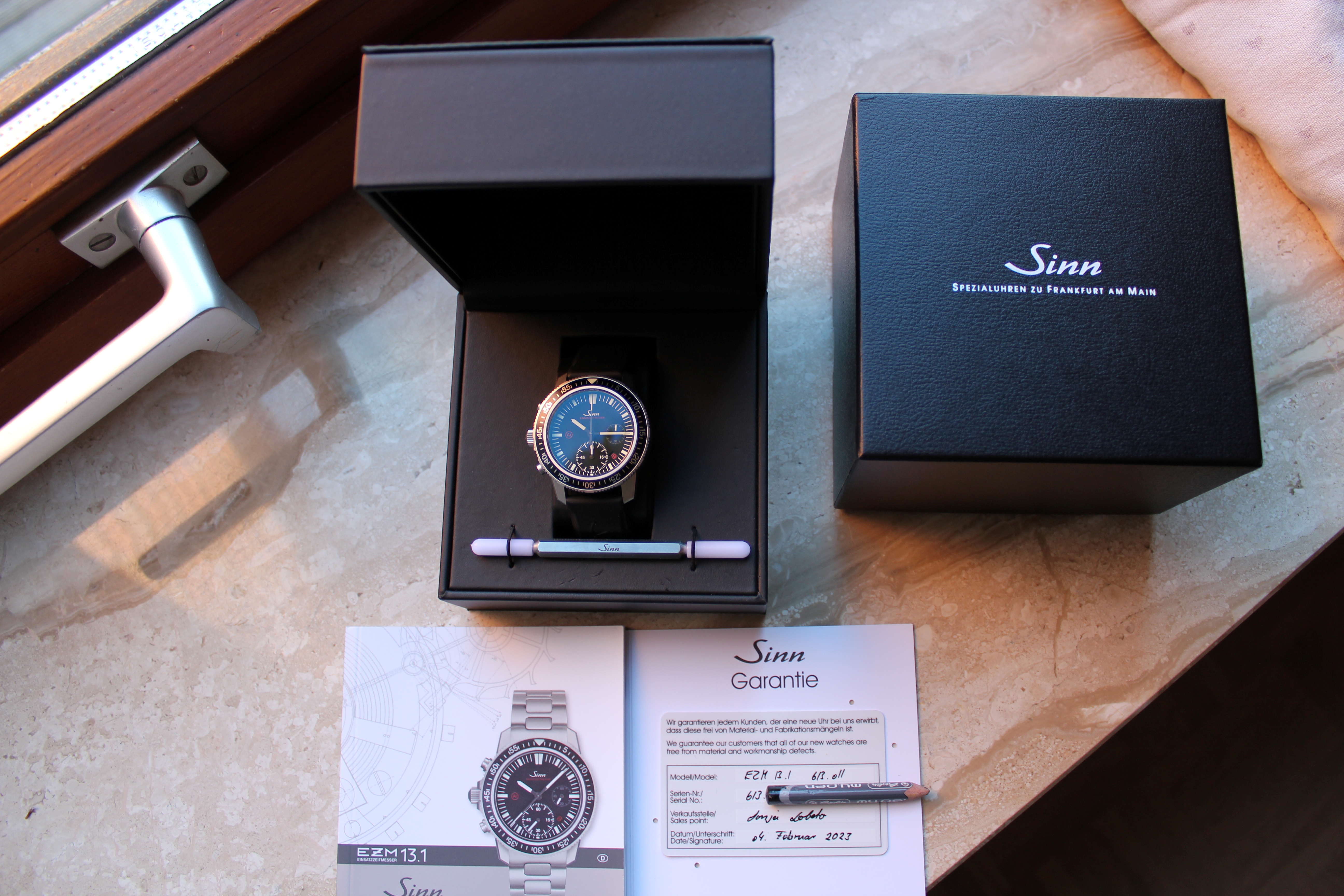 zum Verkauf steht ein sporadisch getragener Sinn EZM 13.1 (Ref. 613.011) aus 02/2023 im Fullset am schwarzen Sinn-Silikonband (ohne Gehäuseintegration) mit Dornschließe.