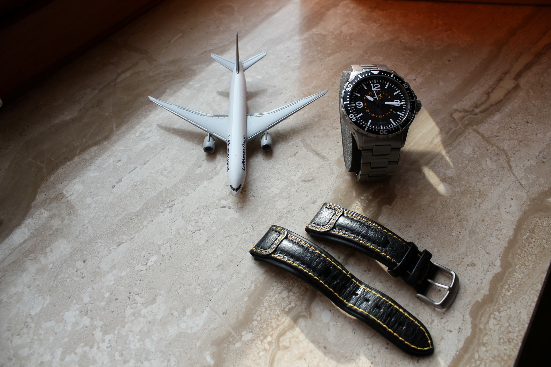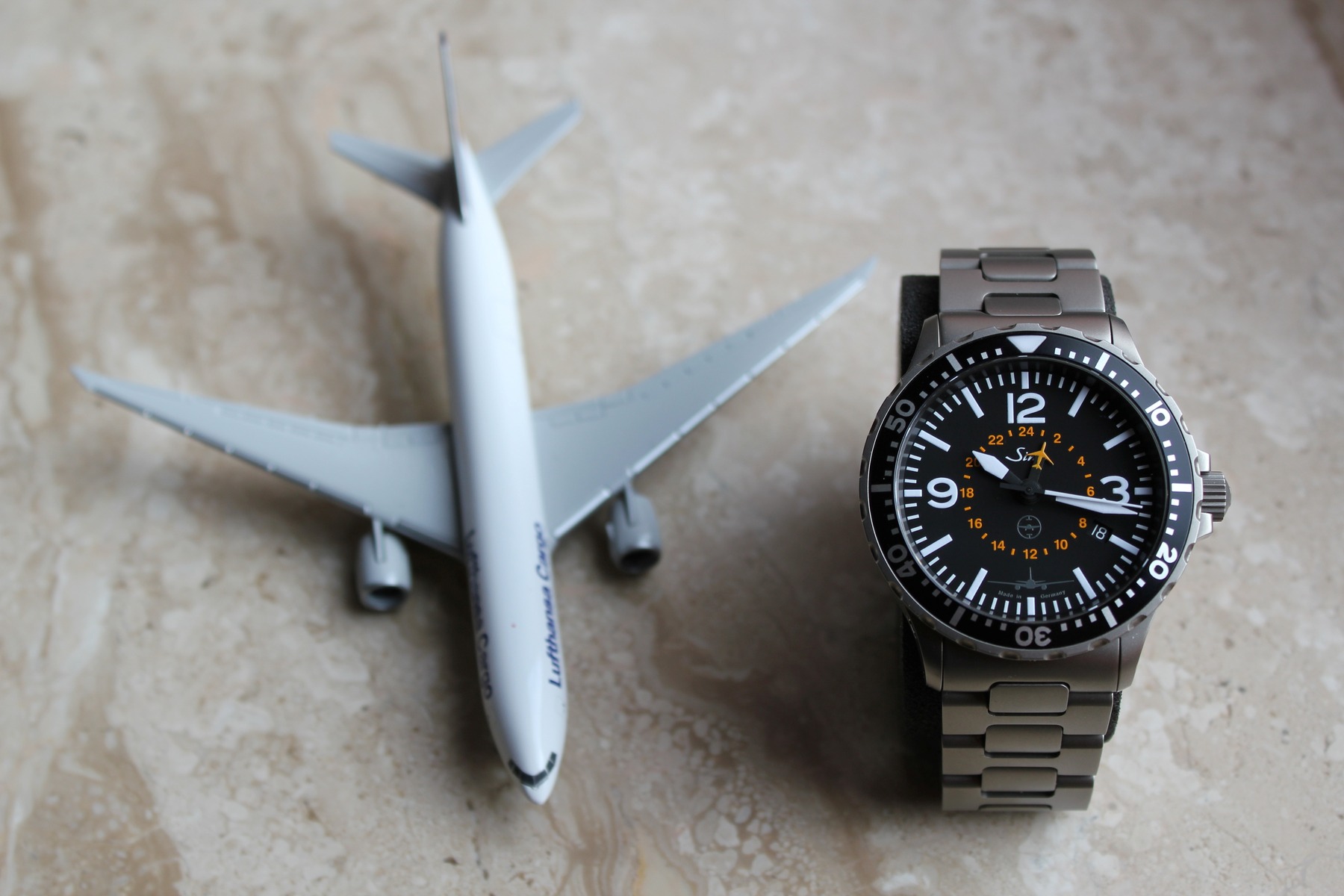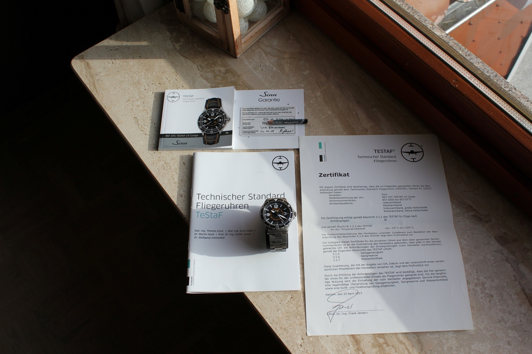 Wichtig bei dieser limitierten und seit Längerem ausverkauften Uhr ist, dass alle Dokumente vollständig enthalten sind (Garantiekarte, TESTAF-Zertifikat, TESTAF-Beschreibung, Bedienungsanleitung zur Uhr). Zudem ist auch das Modellflug ist unbeschädigtem Zustand und die Lufthansa Wertfrachtbox mit dabei. Ebenfalls enthalten ist die Originalrechnung vom Kauf am Frankfurter Römer.