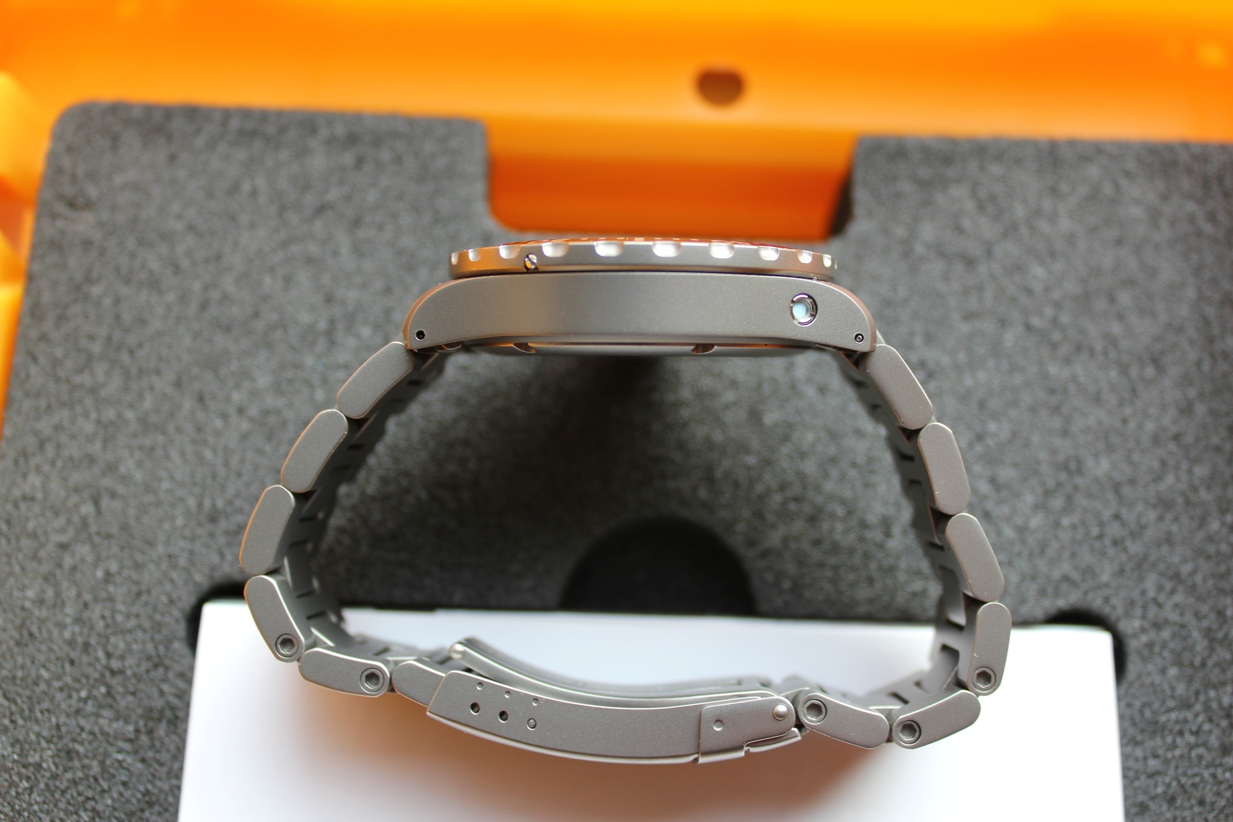 Dank Tegiment-Technologie befindet sich die Uhr in sehr gutem Zustand. Es gibt lediglich leichte Spuren vom Bandwechsel. Auf der Entspiegelungsschicht des Glases sind je nach Lichteinfall leichte Abriebspuren sichtbar. Die Ar-Trockenkapsel ist noch sehr hell.