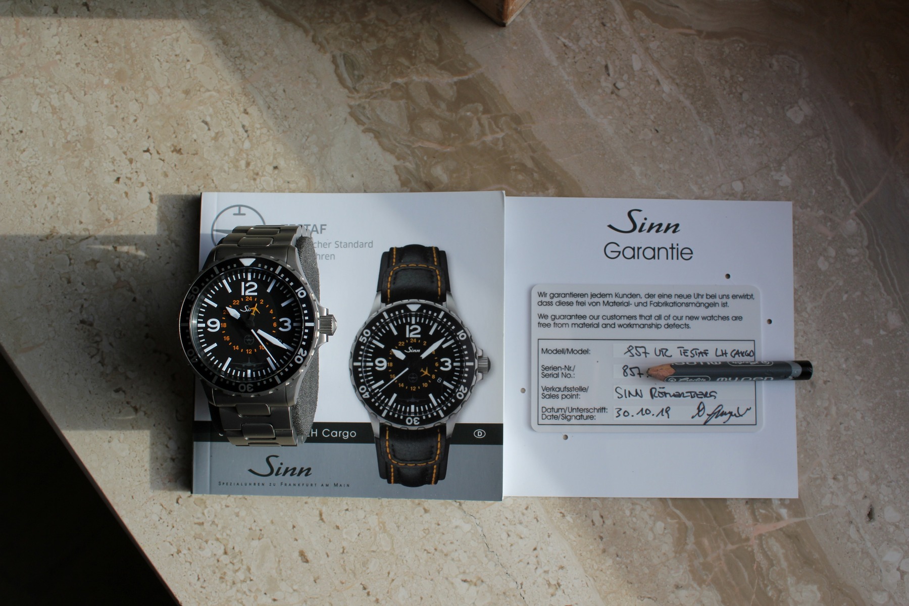 zum Verkauf steht eine sporadisch getragene Sinn 857 UTC TESTAF LH CARGO (Ref. 857.041) aus 10/2019 im Fullset am tegimentierten Massivarmband. Mit dabei ist ebenso das originale Lederarmband mit Gehäuseintegration in der Cargo-Version (Ziernähte in Orange) inkl. Dornschließe.