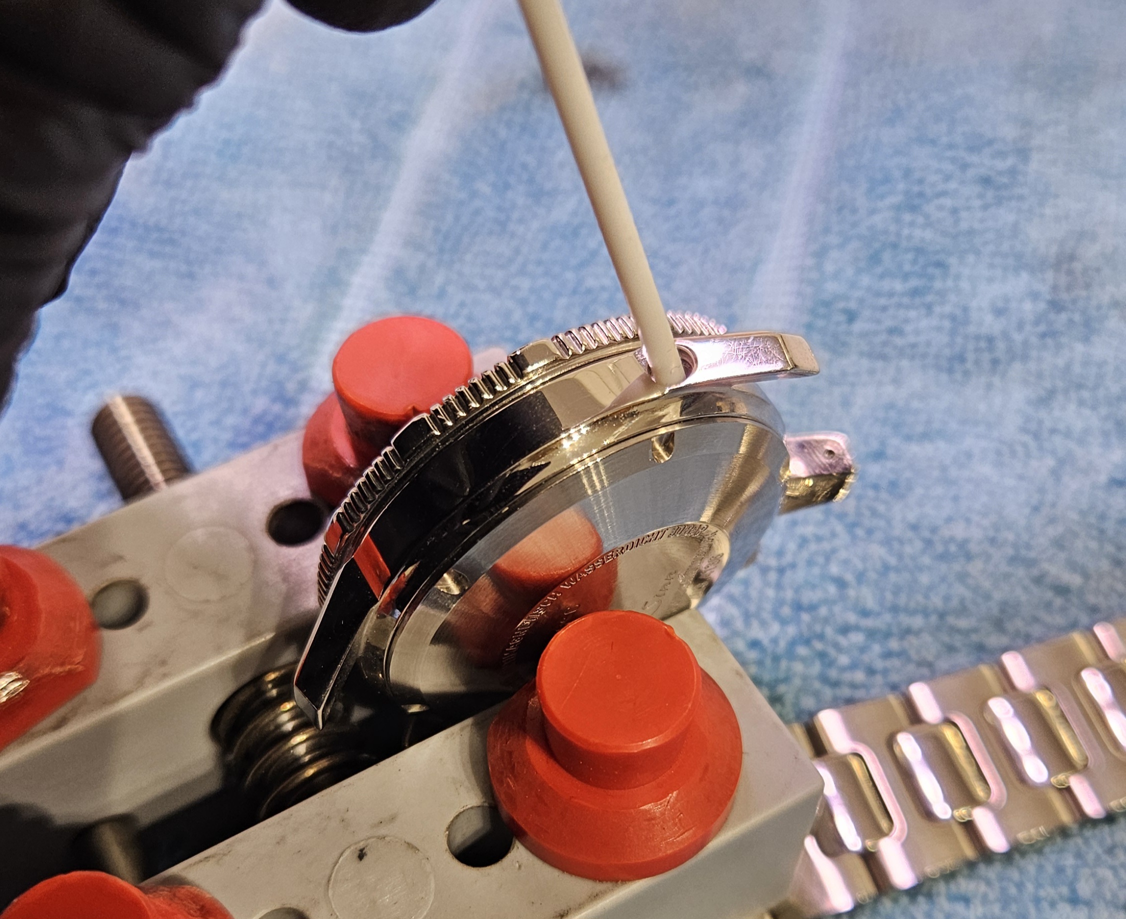 Noch ein Gedankengang, bei einer Uhr mit Schutzgasfüllung sollte das Schutzgas auch weitgehend in der Uhr bleiben, wenn man sie entsprechend mit AR Loch zum höchsten Punkt bei Öffnen positioniert und in der Position lässt, da sowohl Argon als auch Stickstoff deutlich schwerer als Luft sind. Wenn man sie also nicht "auskippt" sollte das meiste drin bleiben... evtl. ein Streifen Klebeband über Loch, um das Austreten durch Luftströme / Wind zu verringern. Ein Drucktest bei einer Uhr, mit der man ins Wasser geht, ist obligatorisch. Nutze ich meine Uhr nur im Trockenen nehme ich es da persönlich aber auch nicht all zu genau, gerade bei so einer "Not"lösung, die keine gesamte Revision ersetzen kann. Wer 100 % will muss halt zu Sinn gehen. Das Gas habe ich mit einer abenteuerlichen Schlauchkonstruktion eingeleitet, nix für immer, zum Testen in Ordnung.