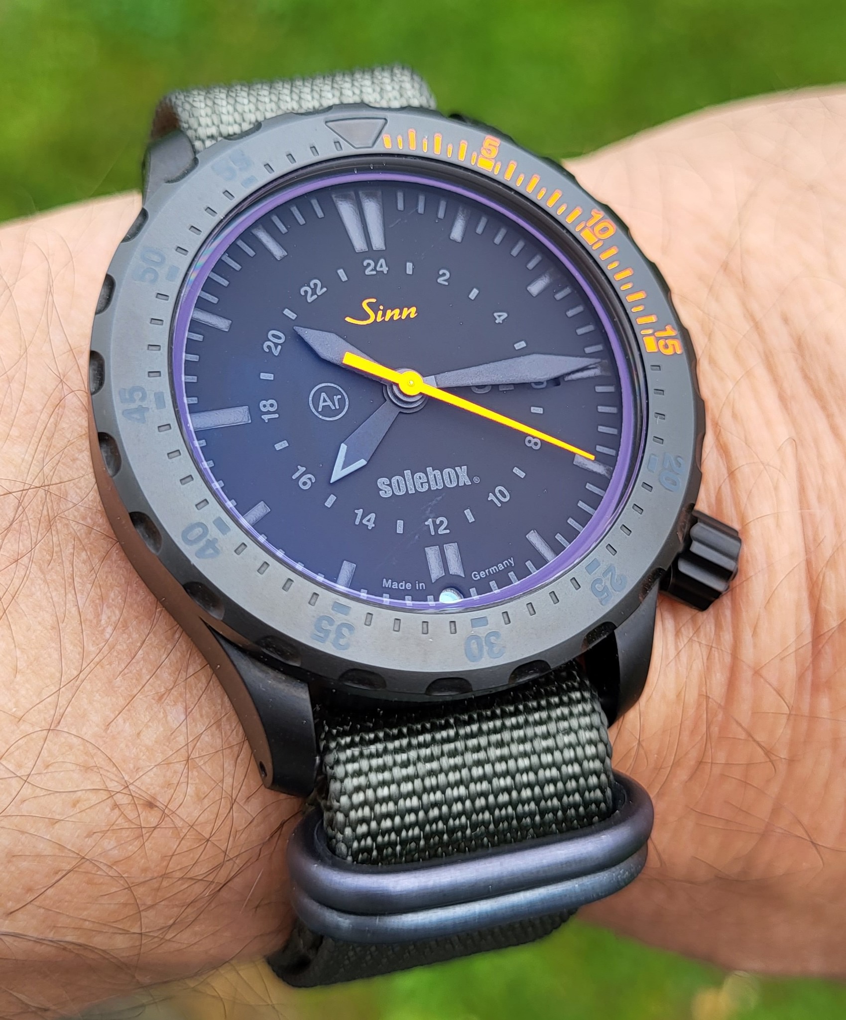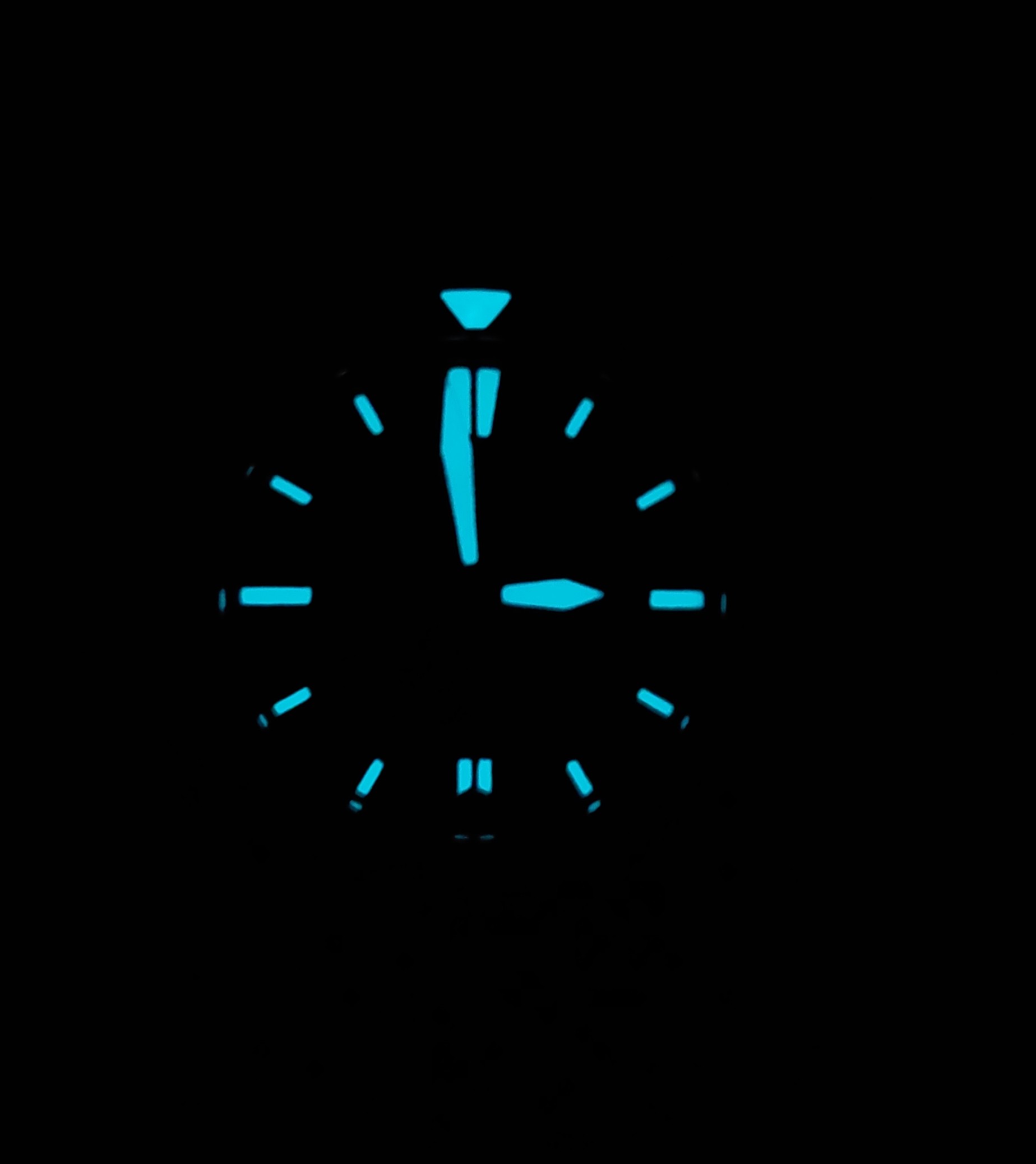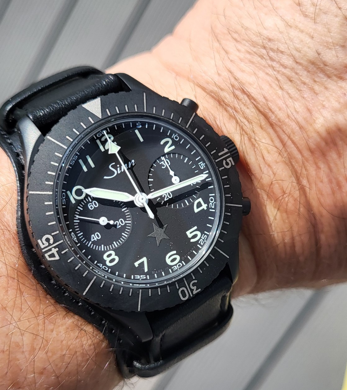 von einigen wurde ein Nightshot der Uhr gewünscht. Nach Einfahrt ins Parkhaus ist mir ein, wie ich finde ein schönes Bild, gelungen. Hier wird auch klar warum die Revolution II Bright Star heißt, obwohl der Stern am Tage ja eher ein "Dark Star" ist. Das Logo des Uhrenmagazin ziert das Ziffernblatt als mit schwarzer