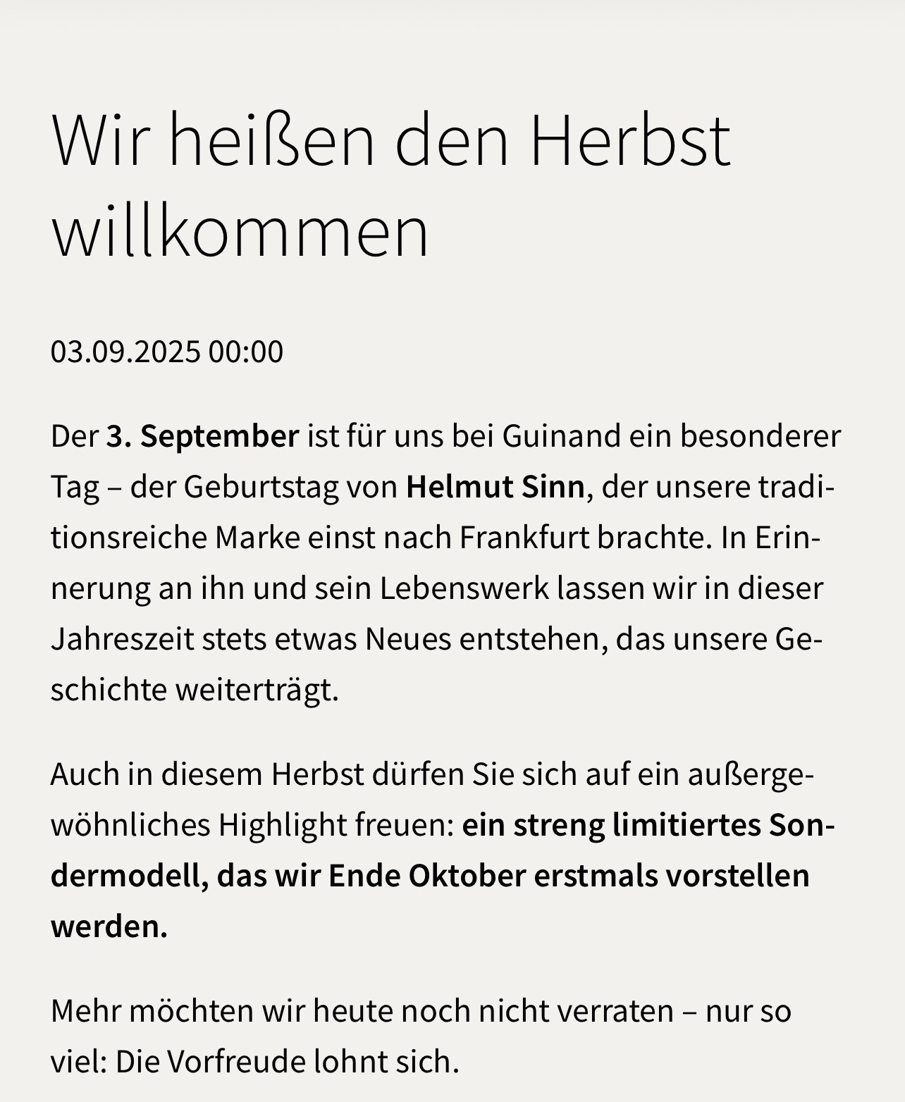 Sinn hat ja am 01.09. bereits seine Sommer-Neuheiten gezeigt. Und frei nach Sepp Herberger gilt: „Nach den Sinn-Neuheiten ist vor den Guinand-Neuheiten.“ Vielleicht zieht Guinand ja am 03.09. noch nach?