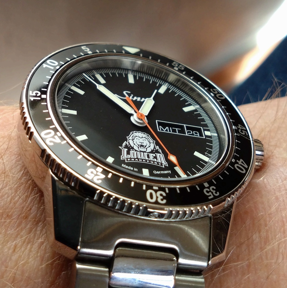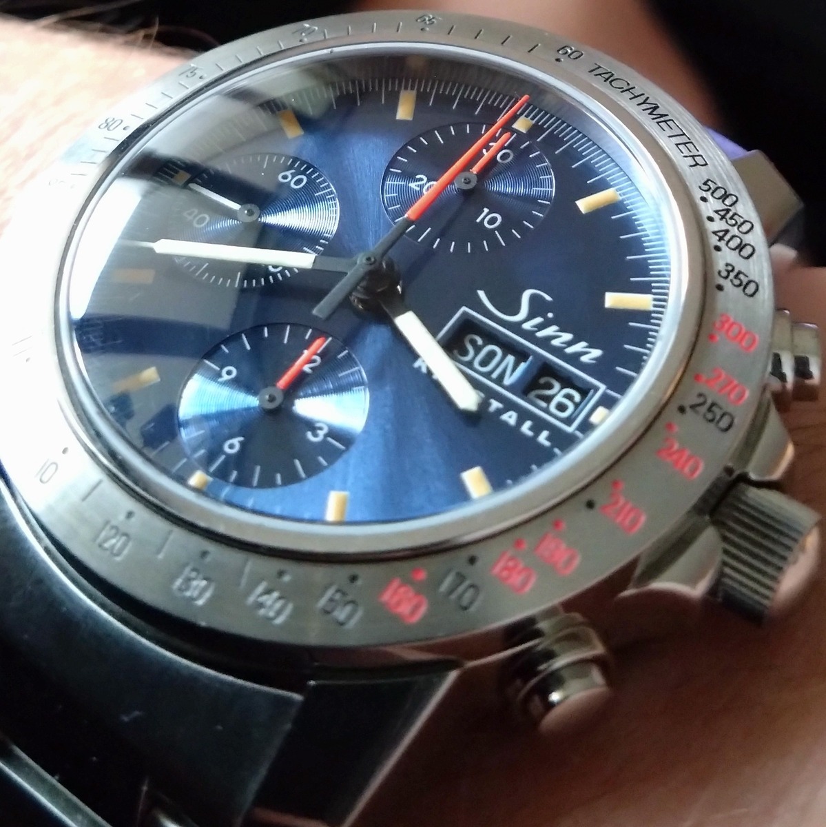 , das blaue Blatt umwerfend aber auch eine der Uhren die am schwierigsten zum fotografieren sind, weil sich das blau mit jedem Blickwinkel verändert.Achja, bei Sinn gibts noch neue Gehäuseringe mit Tachymetergravur. Der Austausch (muß eingeschickt werden) kostete im Januar bei meiner rund 140.- Euro.