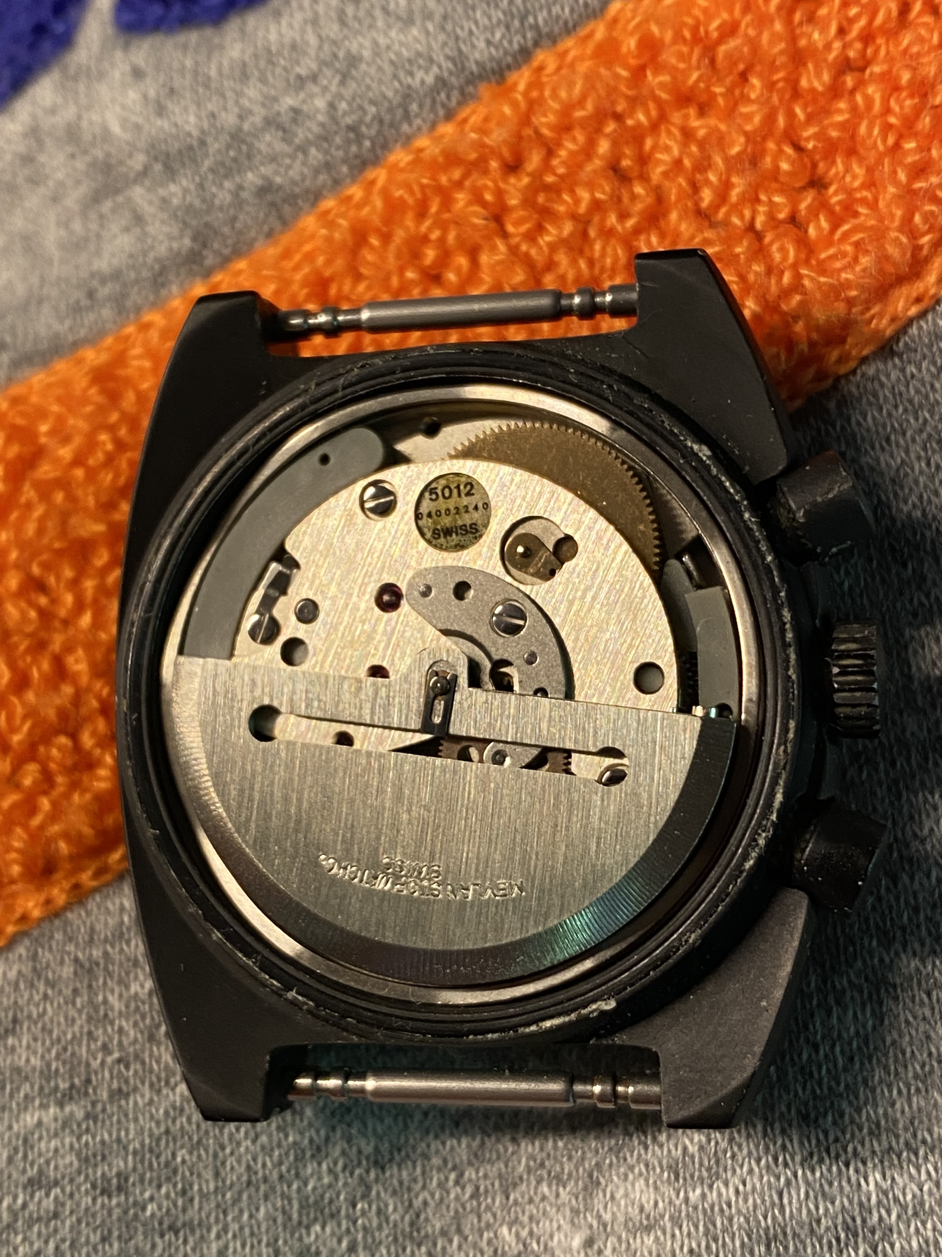 Variante des Valjoux 7750, mit dem Minutenzähler bei 3 statt 12 und Datumsschaltung durch Drücker bei 10. Das Stundenzählerrad habe ich allerdings ausgebaut.