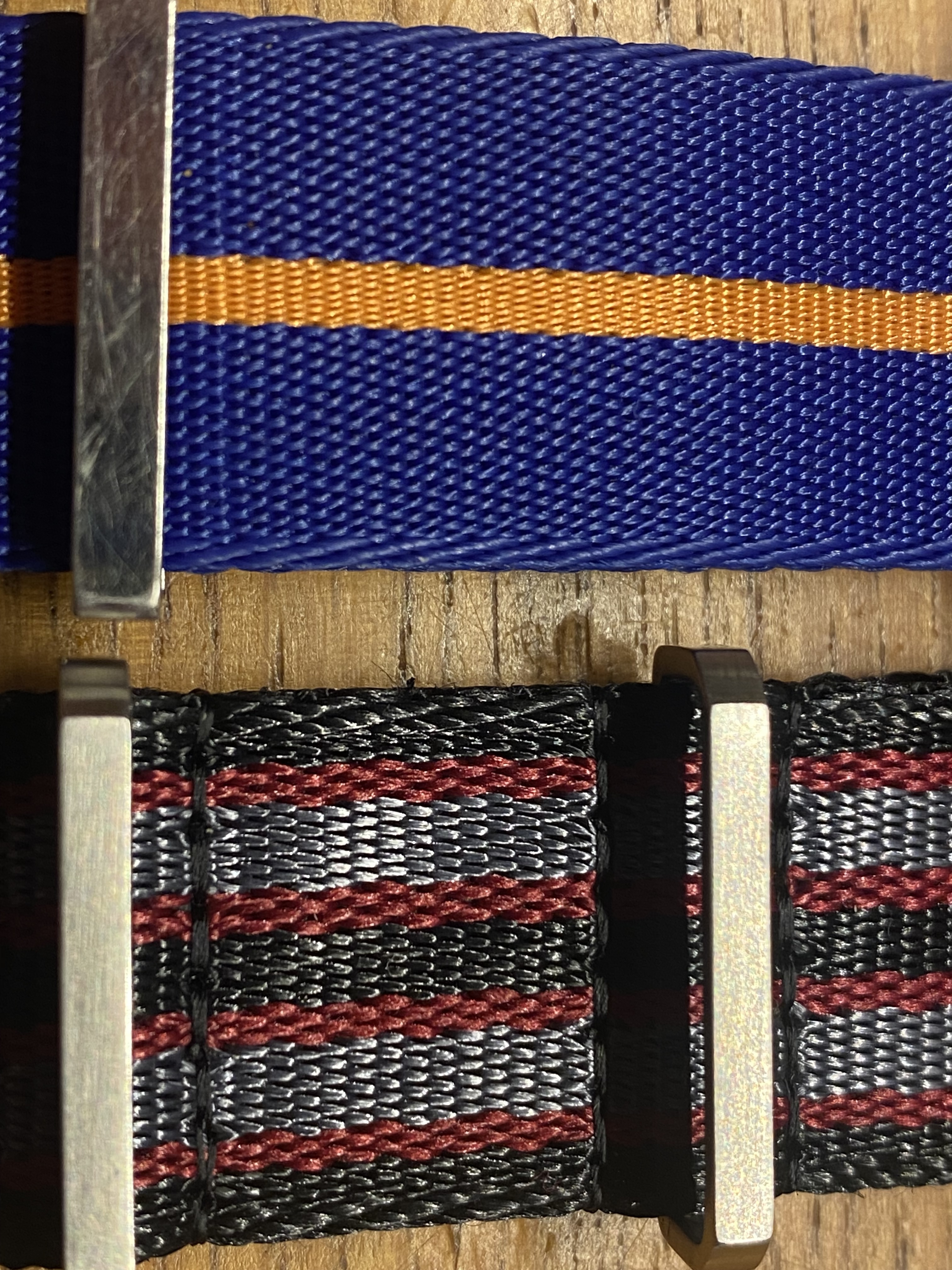 So, wie Ihr den close-ups entnehmen könnt, ist das OMEGA ein bisschen feiner gewoben. Beide Bänder sind außen gewoben und nicht einfach gelasert. Die Durchzugstege sind bei OMEGA einfach rechtwinklig, bei B&S mit Fase. Meine Farbvariante hat einen höheren Glanzgrad als das OMEGA.