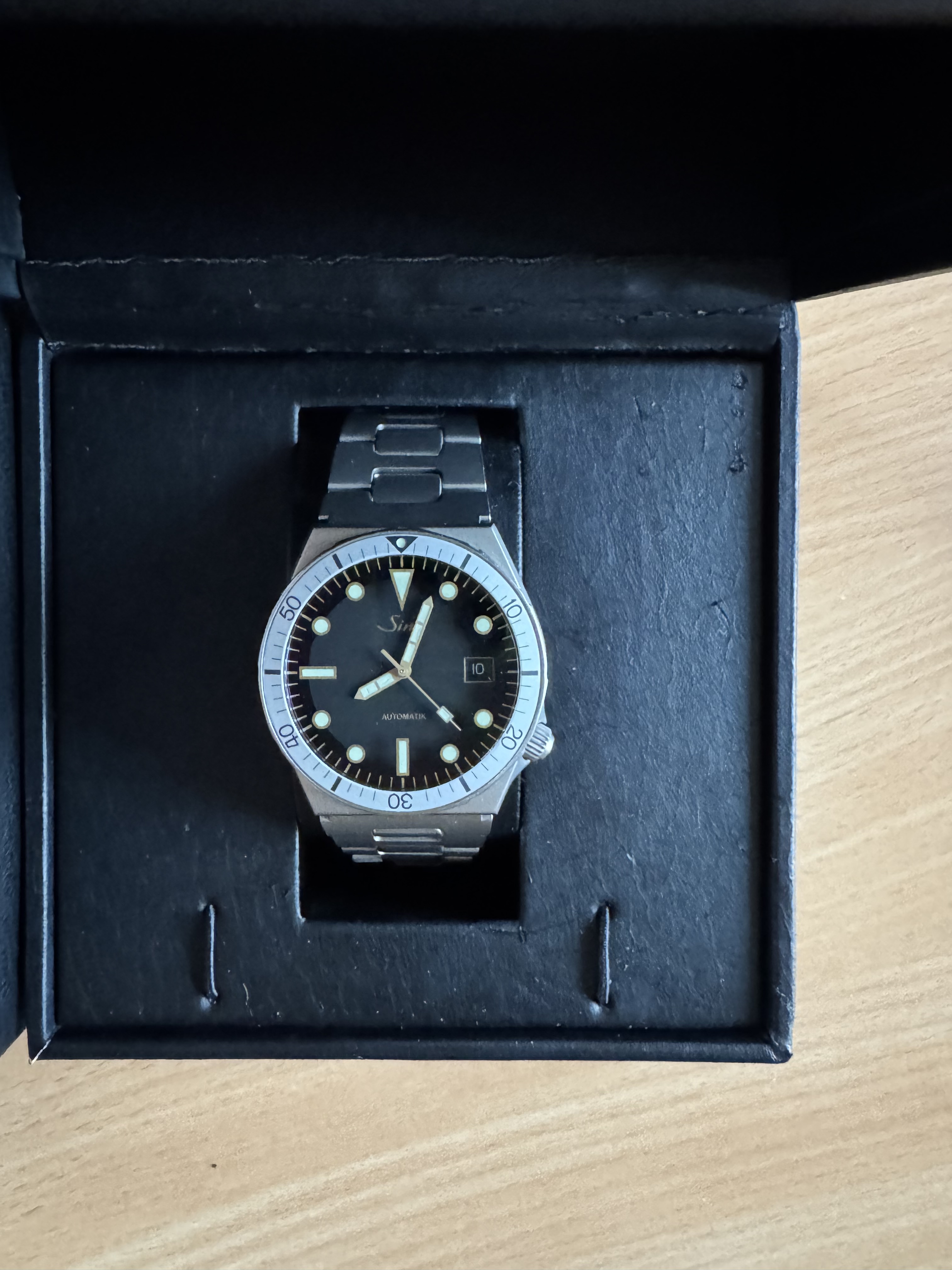 Beruflich arbeite ich im IT Bereich, seit Jahren mit Schwerpunkt ERP-Systeme. Mit Uhren habe ich weniger zu tun, allerdings war ich Taucher und habe mir 1991 als Taucheruhr eine Sinn 809 Automatik Edelstahl gekauft. MIt dieser Uhr war und bin ich immer zufrieden gewesen, nicht zu teuer (zu dieser Zeit lag der Kaufpreis noch bei 450 DM), leicht, flach, ohne unnötige Zusatzfunktionen und immer zuverlässig. 1991 gab es die Uhr noch mit ZRC Armband, für das Tauchen optimal, da selbst mit Neoprenanzug das Armband leicht zu schließen war). Im Jahr 2005 war ich einmal bei Sinn in Frankfurt (liegt in der Nähe von Kleinostheim) und habe mir noch einmal das gleiche Modell gekauft (gezwungermaßen aber mit einem anderen Armband), da die Produktion bald eingestellt werden sollte.
