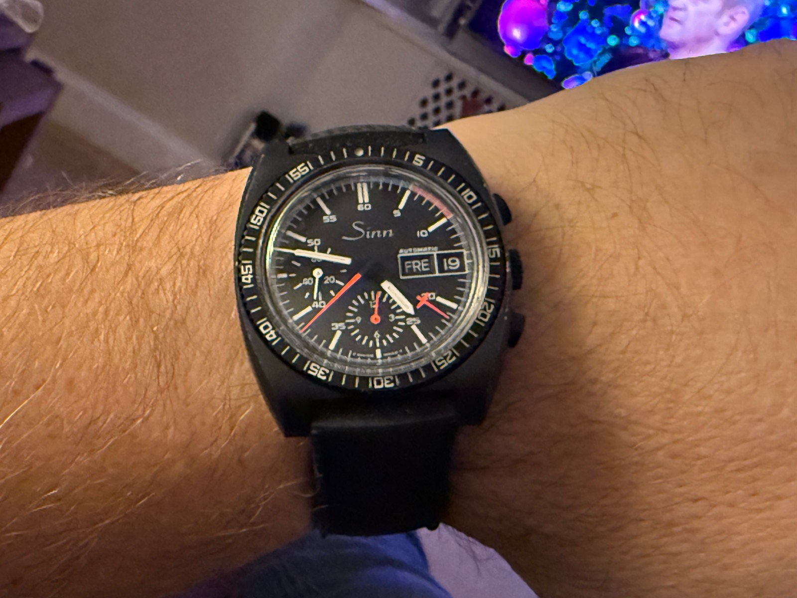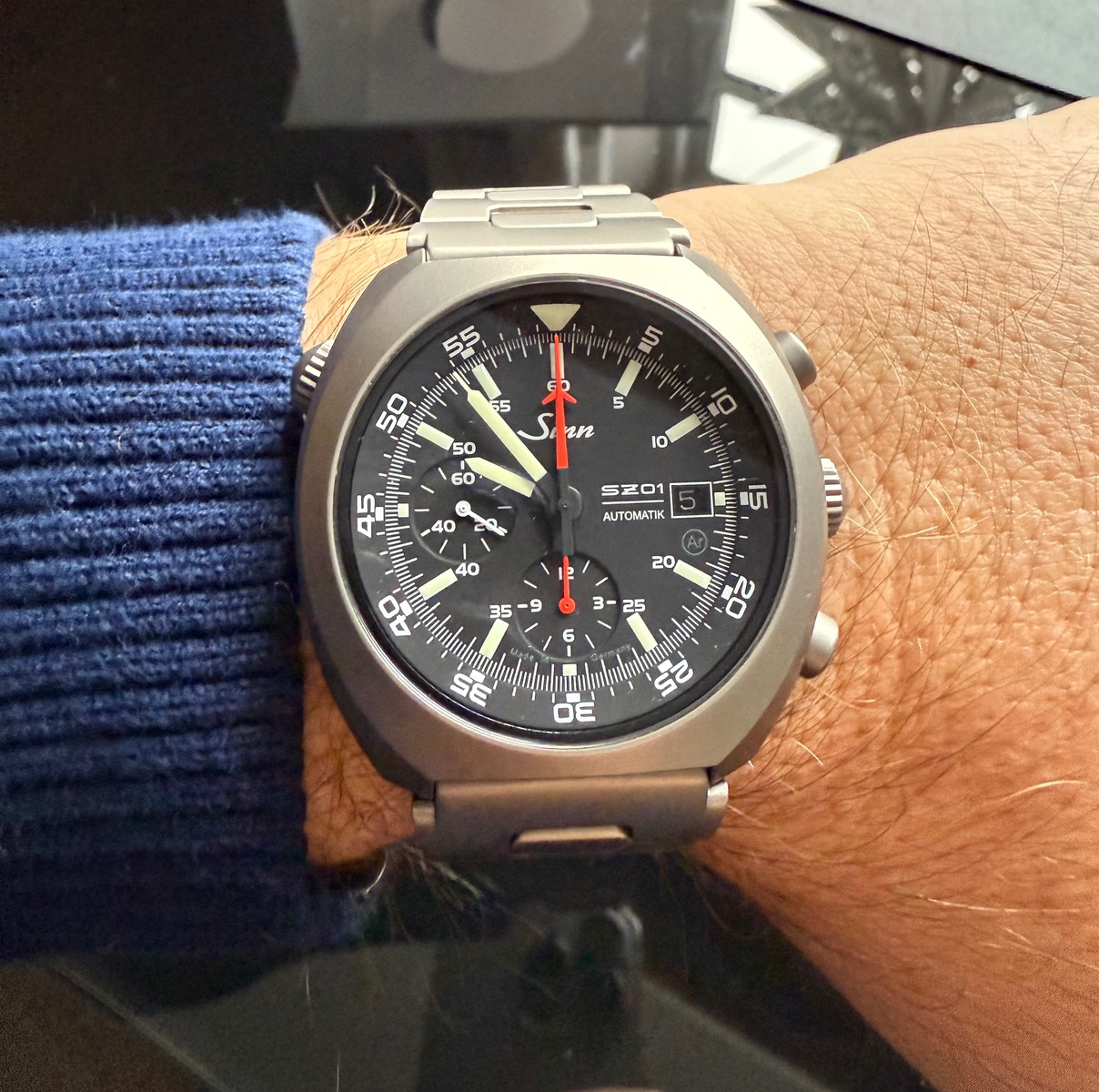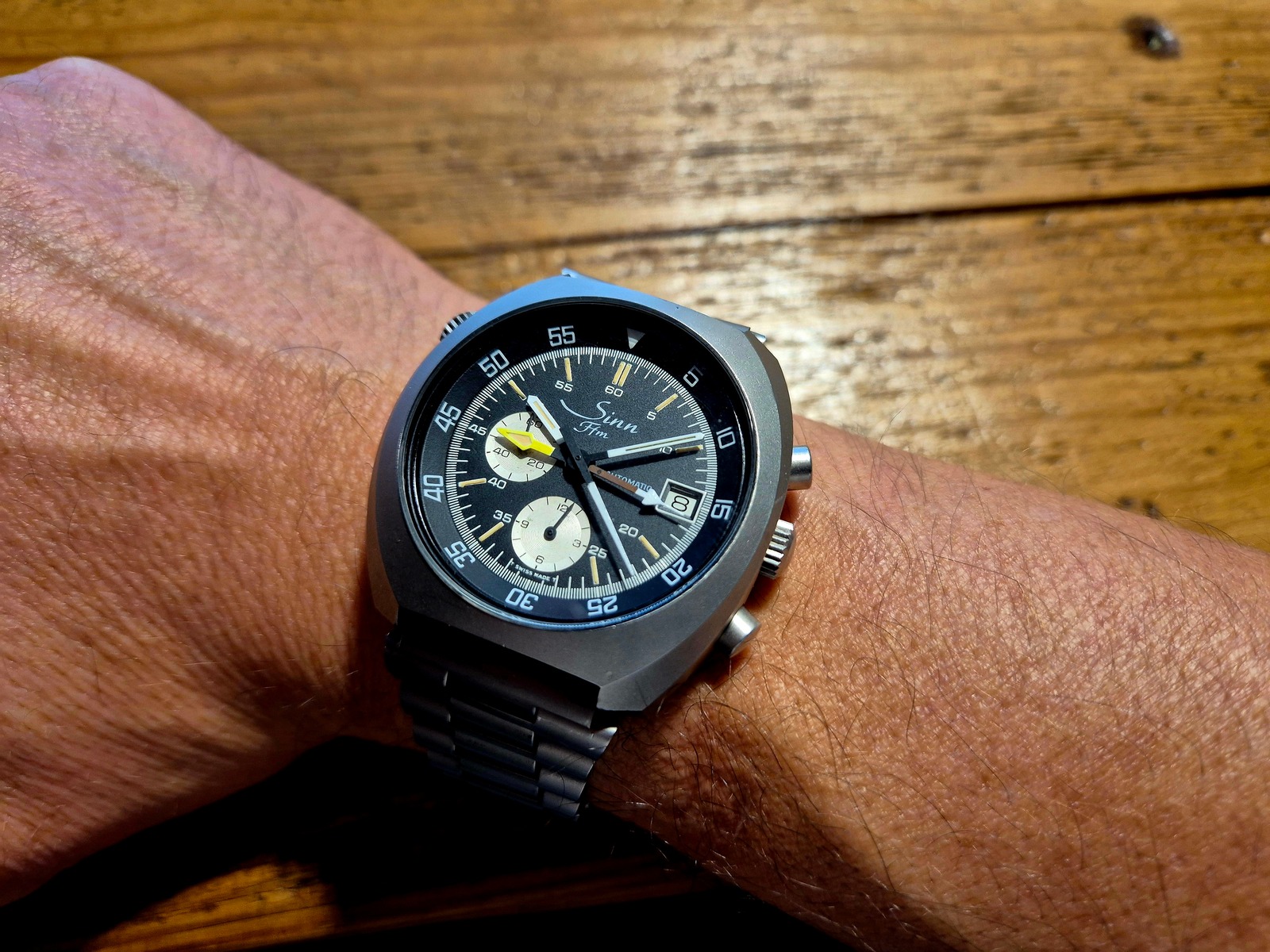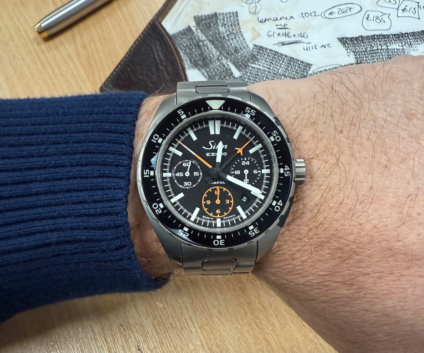 Da sie zu den kleineren Uhren meiner Sinn-Sammlung gehört, trage ich sie nur selten. Ich trage sie seit dem zweiten Tag und es ist absolut keine Gangabweichung seit dem Einstellen der Zeit feststellbar. Sie ist an einem Steveo-Canvas-Armband, das ich speziell für diese Uhr anfertigen ließ – sie ist die einzige meiner Uhren mit einer Bandanstoßbreite von 18 mm.