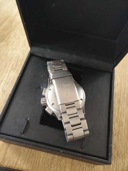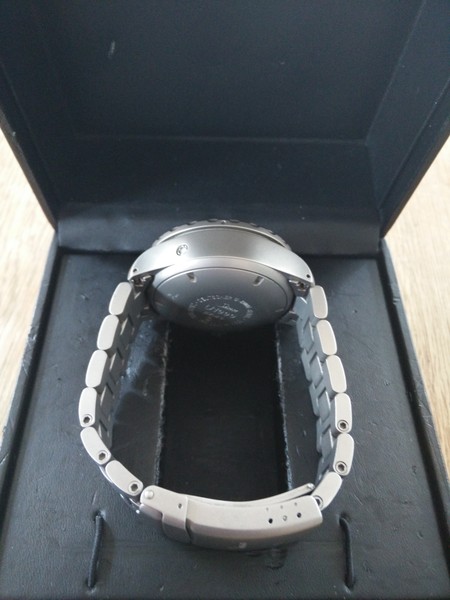Also Box und Papiere sind vorhanden, das Stahlband ist komplett und die Uhr hatte keine Revision.