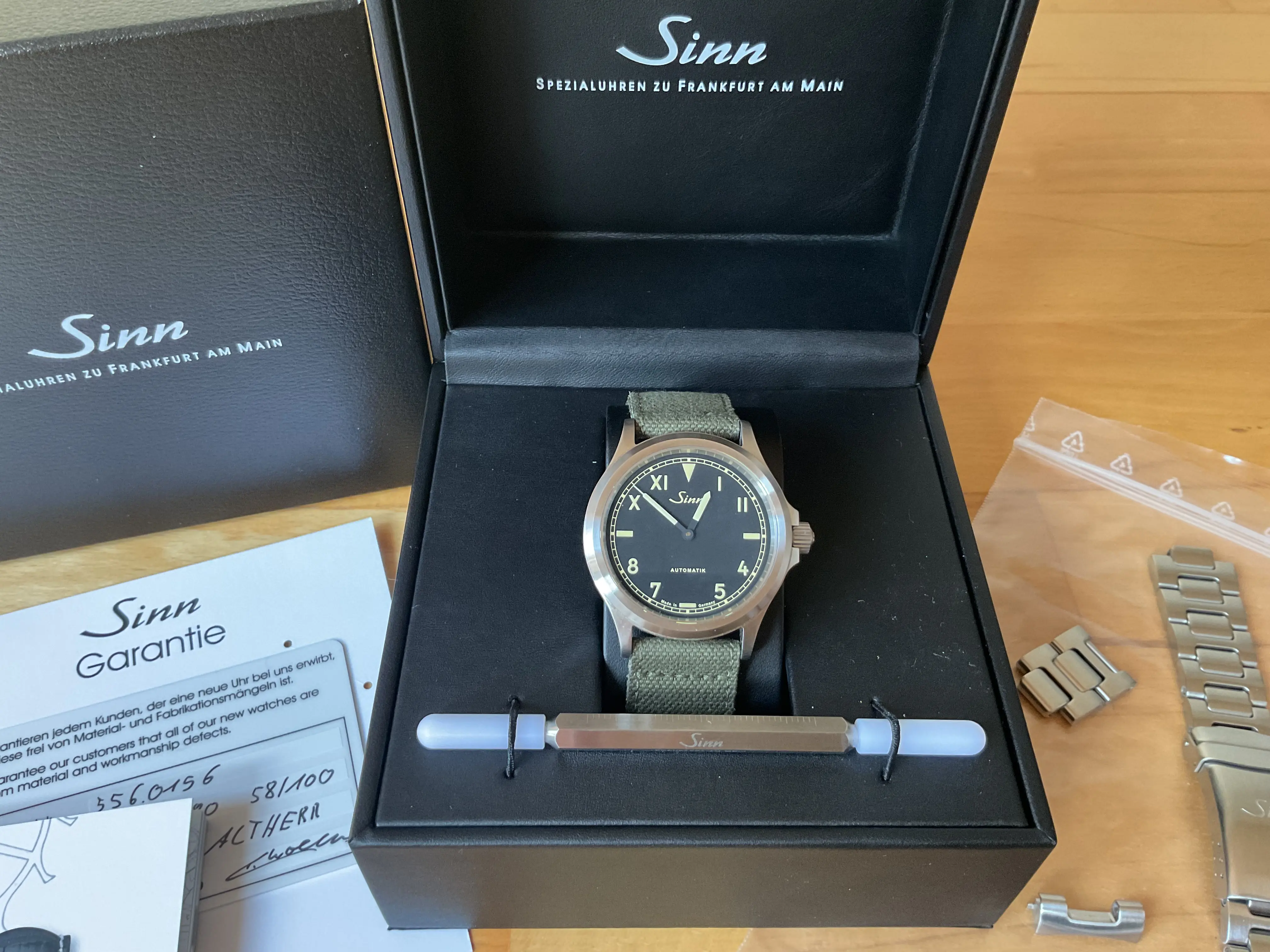 Zum Lieferumfang gehören die Uhr mit dem verbauten schwarzen Sinn-Silikonband mit schwarzer Steinhart-PVD-Schließe (Neupreis insgesamt 80,00 Euro), ein leicht getragenes braunes Sinn-Rindslederarmband in Vintage-Optik mit schwarzer Ziernaht und schwarzer Sinn-Stiftschließe (Neupreis 75,00 Euro) sowie ein ungetragenes schwarzes Sinn-Kalblederband mit schwarzer Dornschließe, das zur Auslieferung dazu gehörte. Darüber hinaus die Sinn-Box mit Umkarton, die unausgefüllte Sinn-Garantiekarte, eine Kopie der Kaufrechnung sowie die Bedienungsanleitung. Es besteht eine Restgarantie gegenüber der Fa. Sinn bis November 2019.