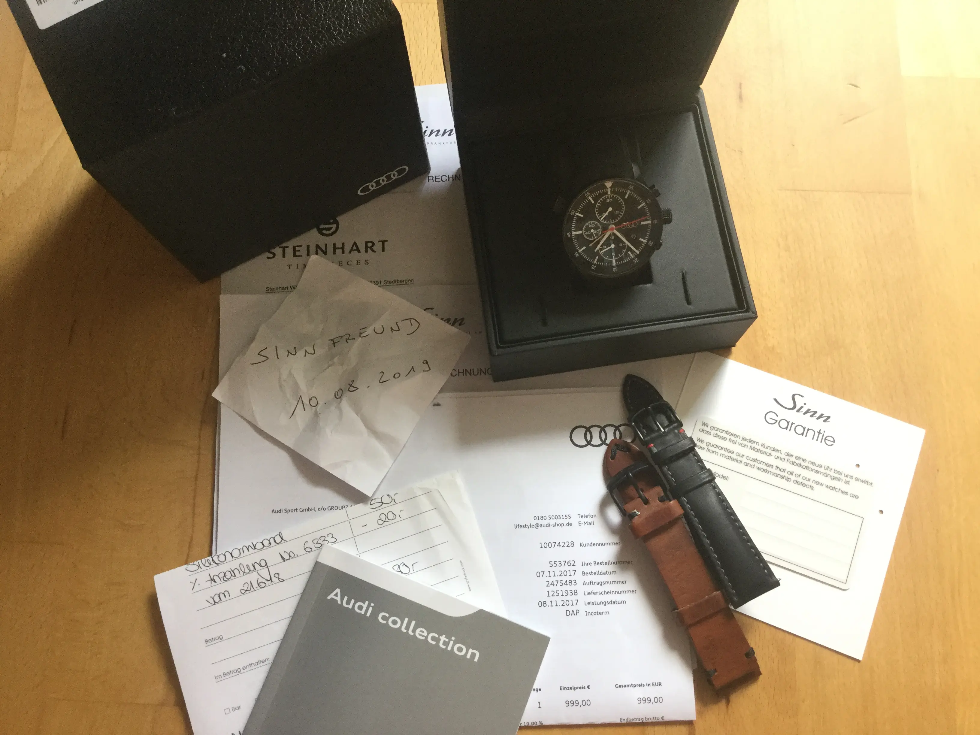 ich biete Euch meinen Sinn-Chronographen Audi Design Limited Edition (limitierte Auflage von 300 Exemplaren) zum Verkauf an. Die Uhr wurde von mir im November 2017 im Audi Shop gekauft.