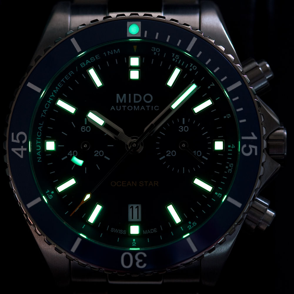 Dem Sekundenzeiger hat MIDO sogar Leuchtmasse innerhalb einer pfeilförmigen Spitze spendiert, ebenso wie dem Stoppsekundenzeiger, dessen Spitze zusätzlich etwa 5 mm weit mit orangener Farbe versehen ist. Dieser „Farbklecks“ harmoniert meiner Meinung nach gut mit dem orangenen Dreieck auf dem Rahaut und der gleichfarbigen Beschriftung „OCEAN STAR“ oberhalb des Datumsfensters.