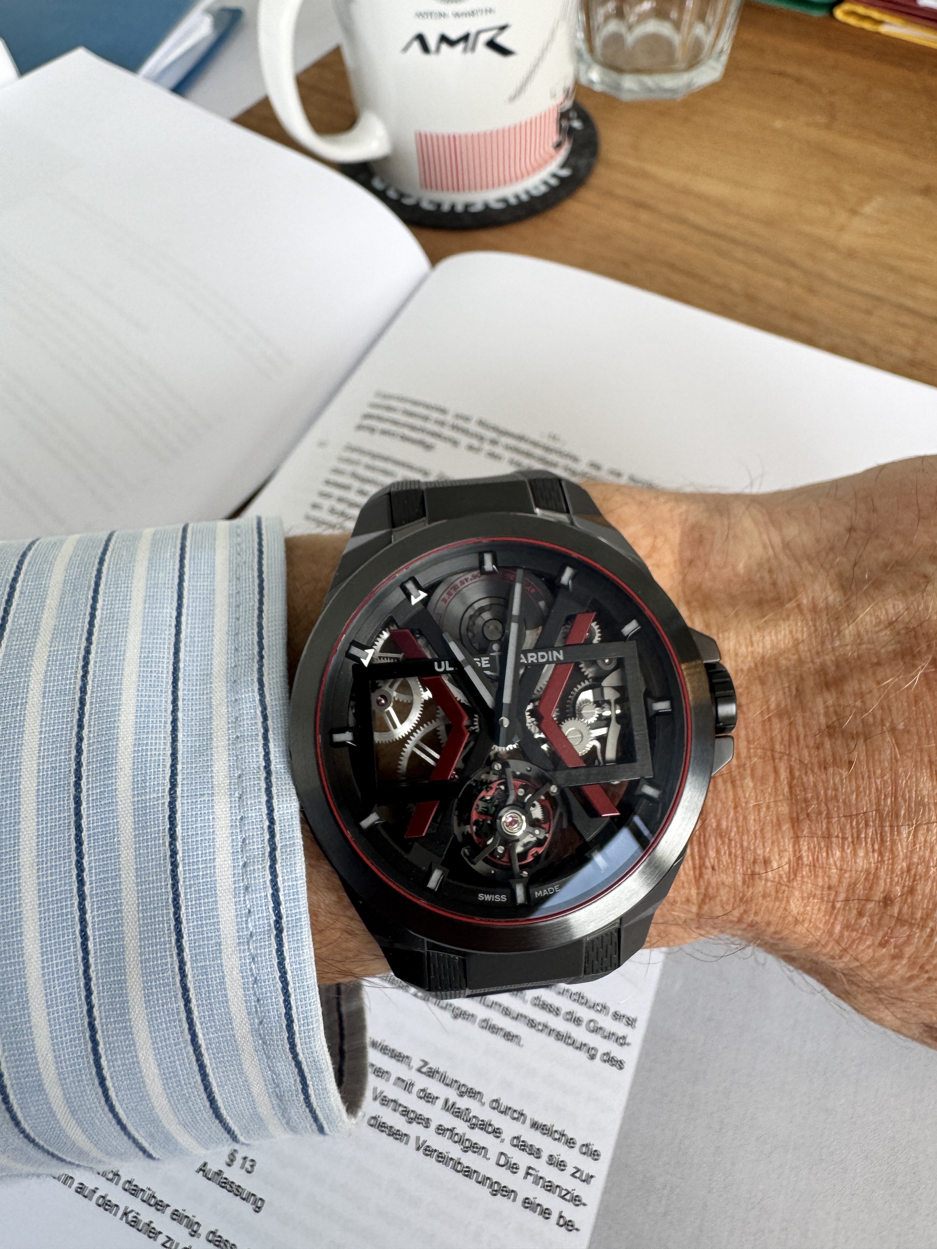 Moin, so, nach langer Zeit mal hier wieder aktiv. Habe vor einer Woche das Jubiläumsmodell bestellt und gestern konnte ich es schon in Frankfurt abholen. So muss das. Aber es musste ein anderes Band dran - das Metallband ist mir dann doch zu viel blingbling und die Farbe des dazugehörigen Lederarmbandes ist - sagen wir es mal vorsichtig - interessant.