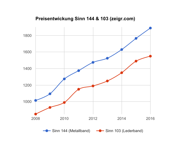 Als grafische Ergänzung zu dem Thema - hier die Preisentwicklung der Sinn 144 und 103 der letzten Jahre.