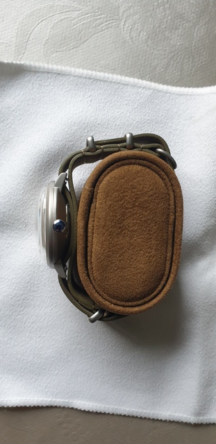 Handaufzugskaliber LUTSCH 1801.1 mit 15 Steinen, 21.600 Halbschwingungen, Stoßsicherung und 38 Stunden Gangreserve. Mit Etui, Leder Durchzugsband.