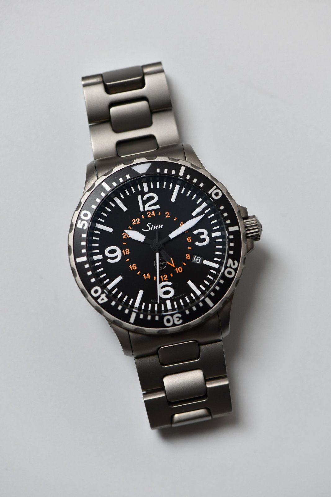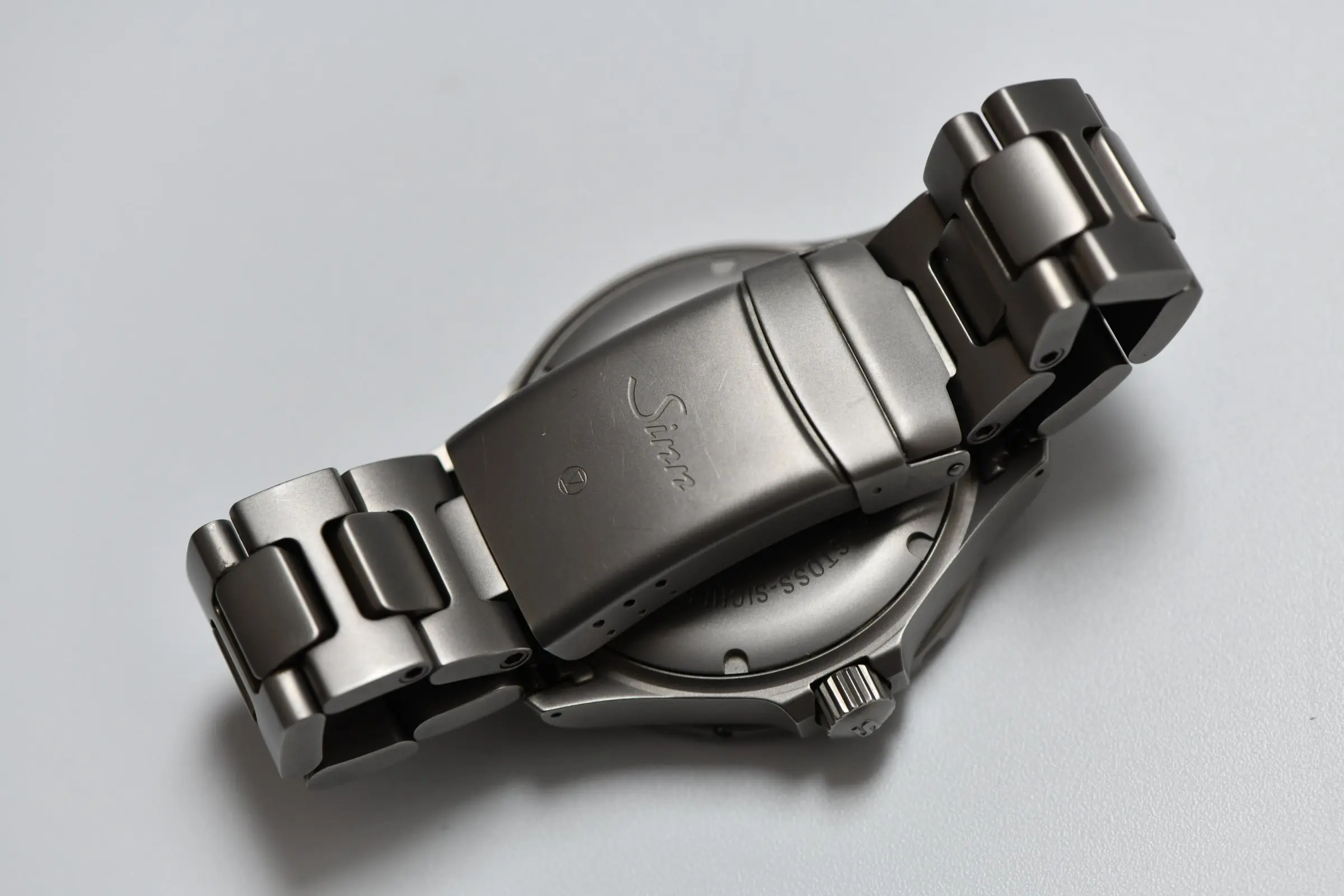 Mitgeliefert werden neben der Uhr am Massivband die entnommenen Bandglieder, zwei INBUS-Schlüssel, Sinn-Bandwechselwerkzeug, außerdem die kompletten Papiere (Anleitung, Garantiekarte, TESTAF-Zertifikat) sowie die Sinn-Box mit Umkarton.
