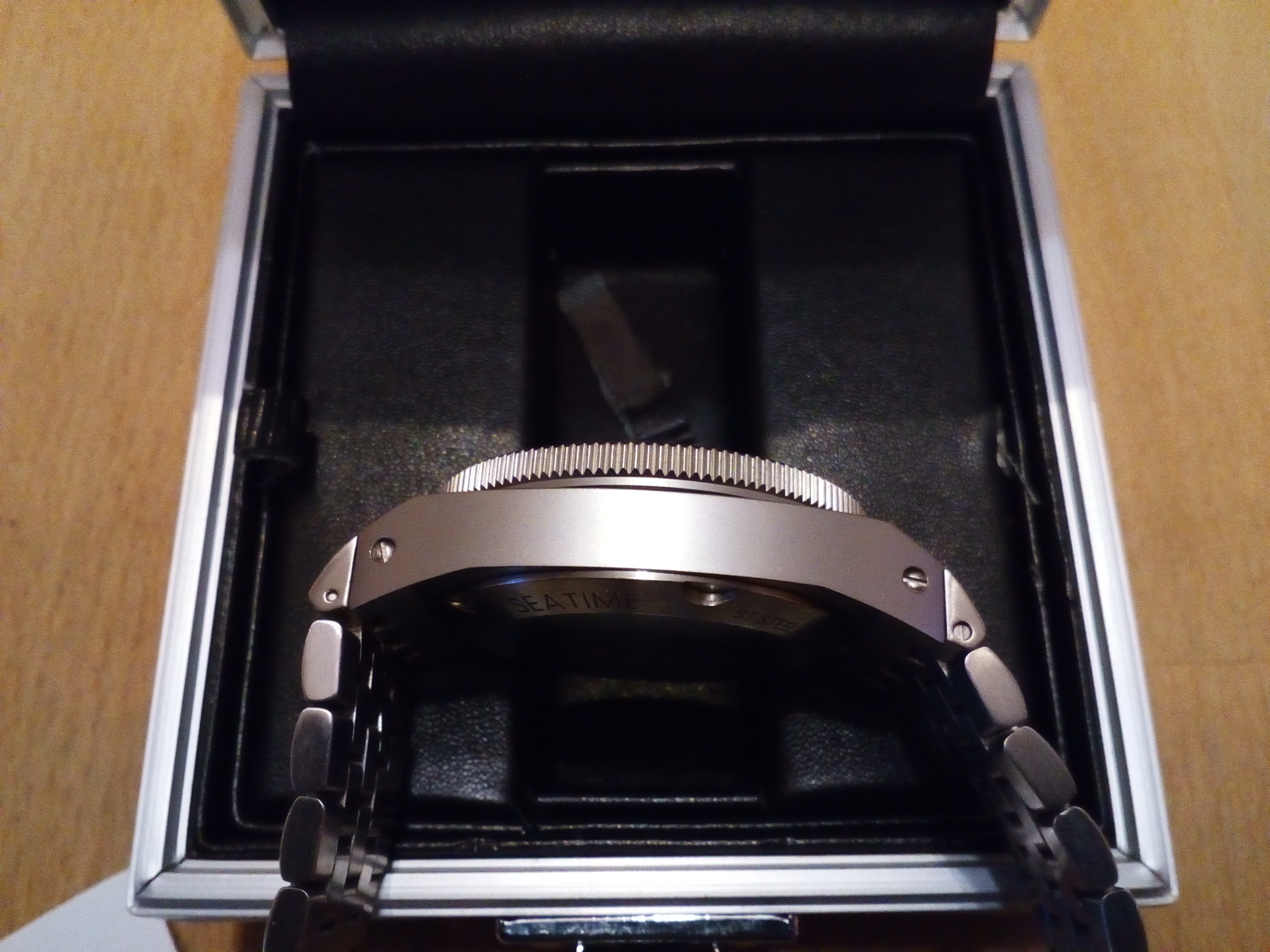 Im Paket sind die Uhr mit orangen Zifferblatt, Nummer 007, das originale Stahlband, 2 x Lünette schwarz und Stahl, 3 Paar Schraubstege