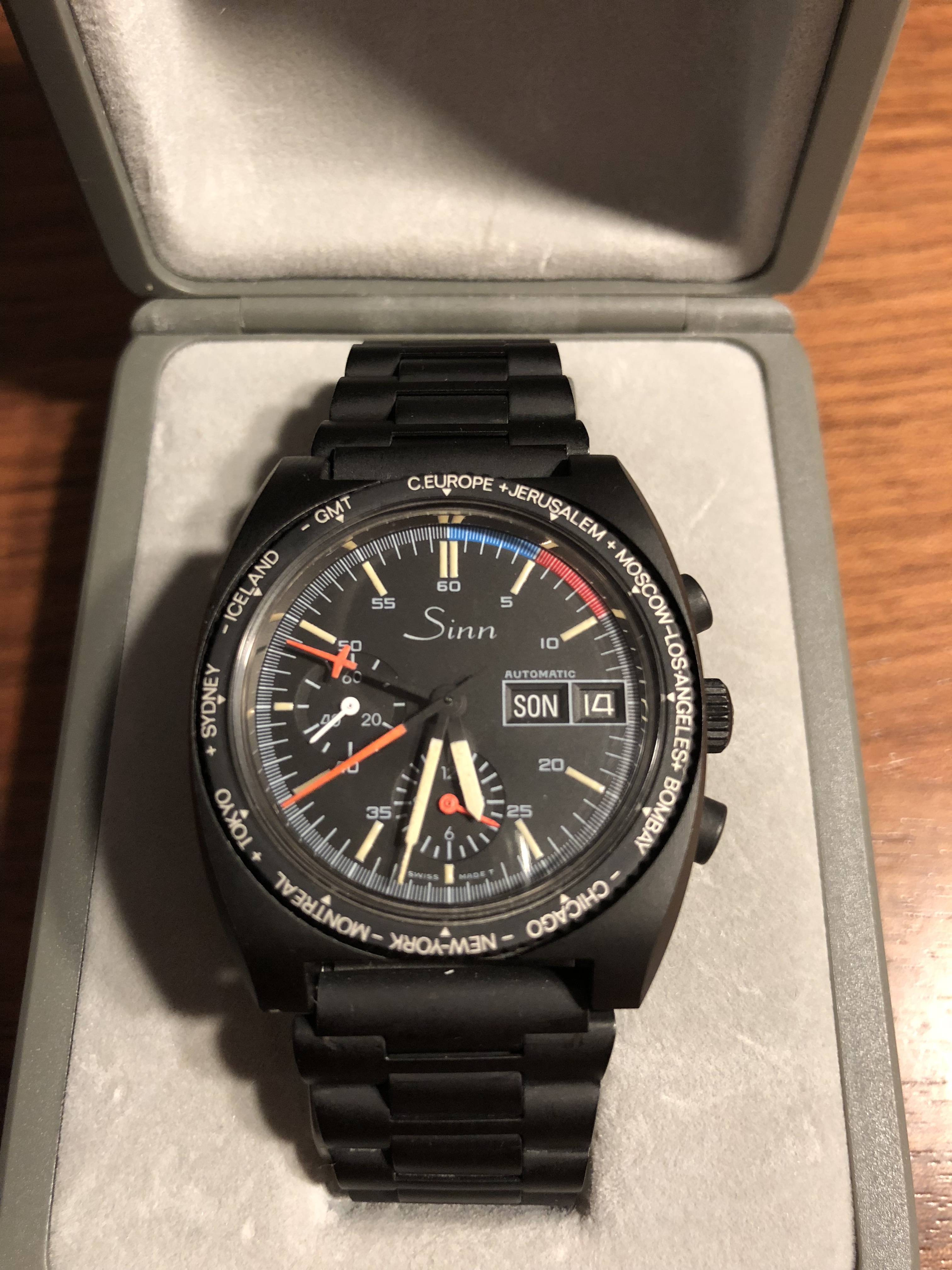 Nun, hier ist meine SINN mit dem Lemania 5100 und der Weltzeit Lünette aus 1987.